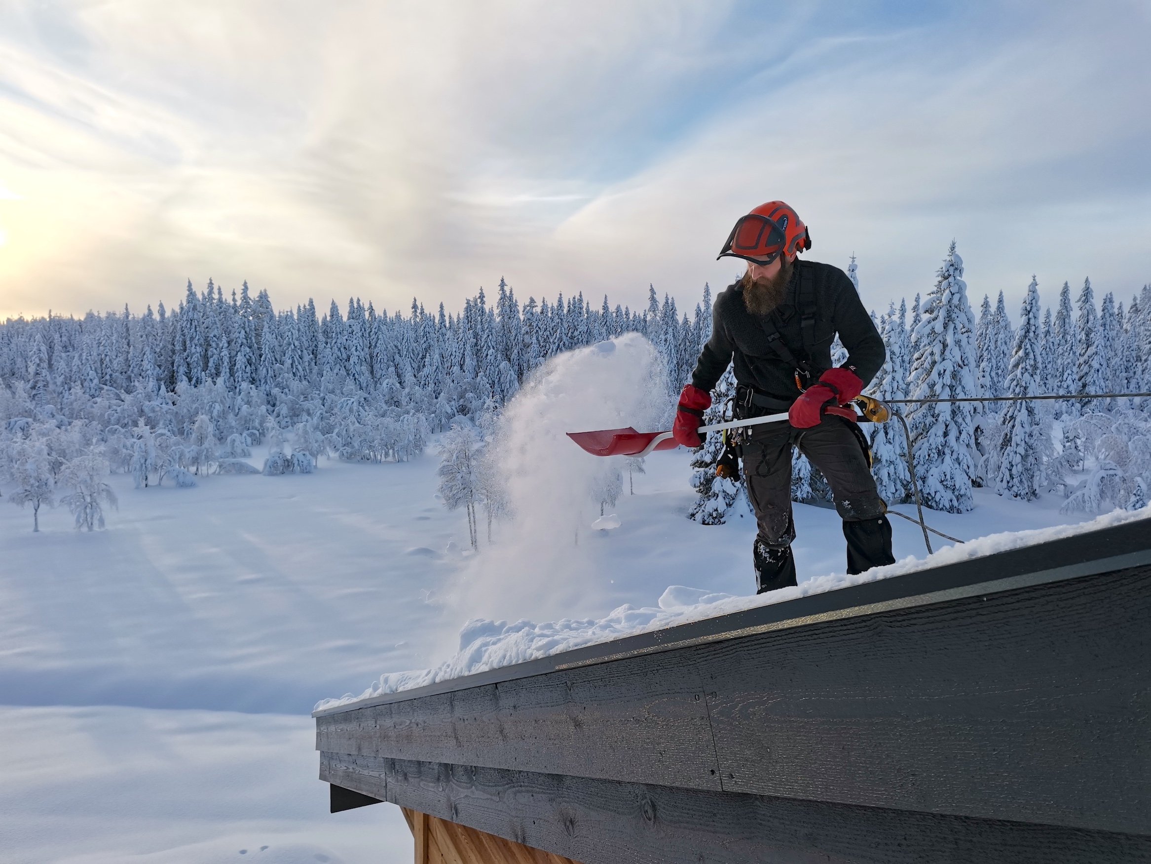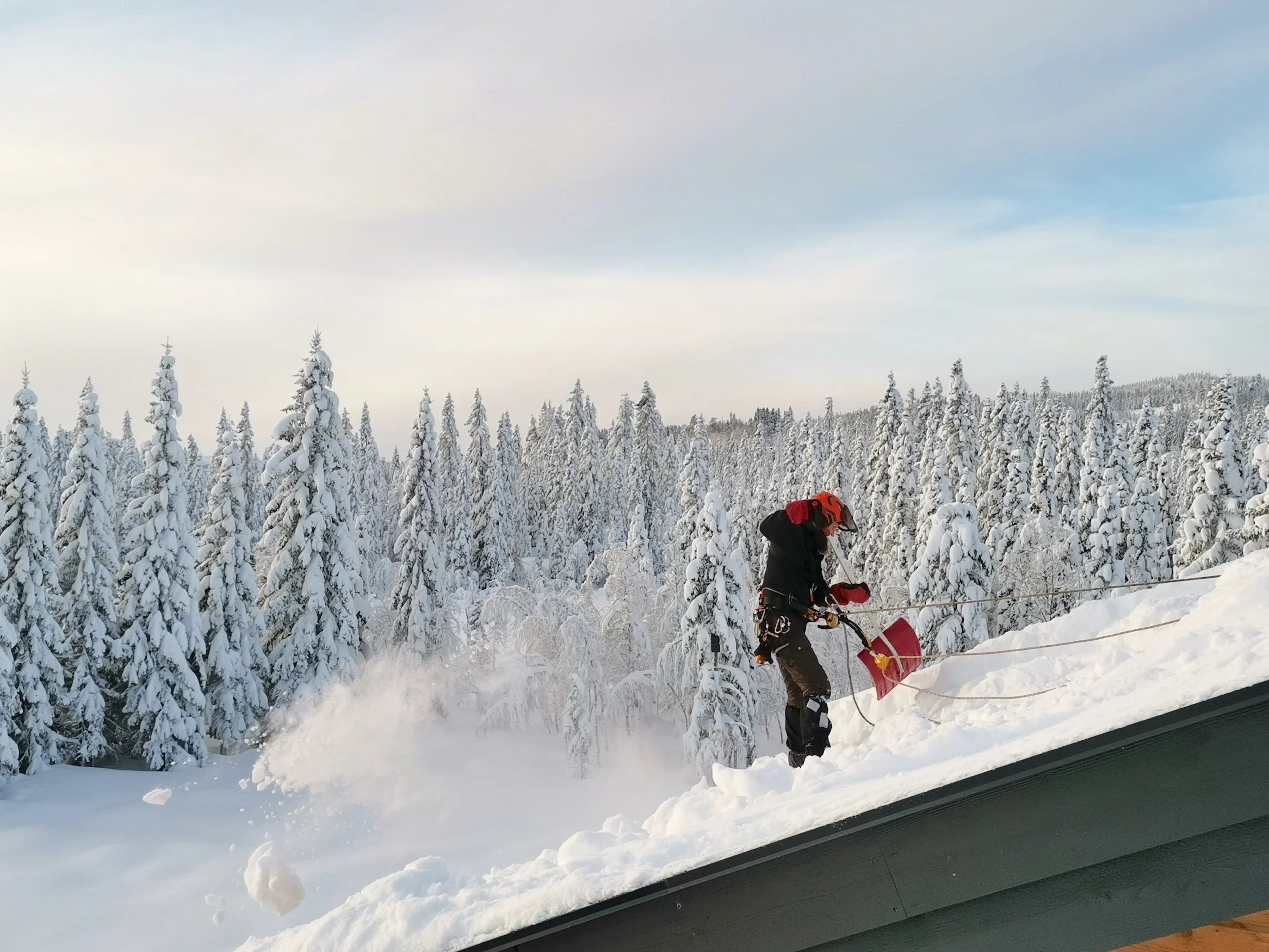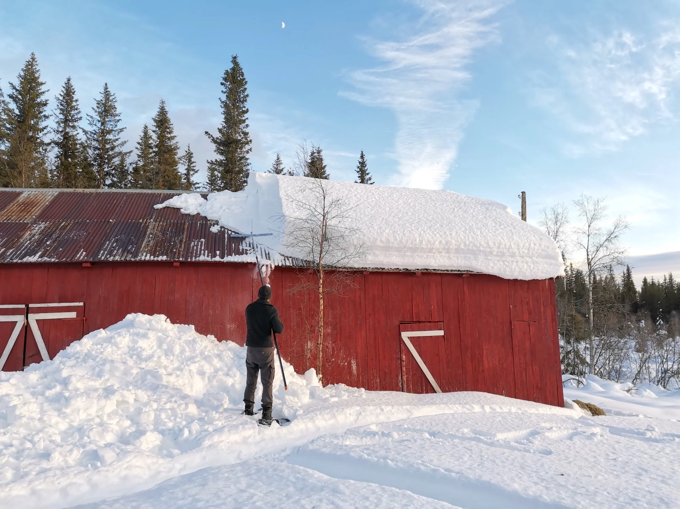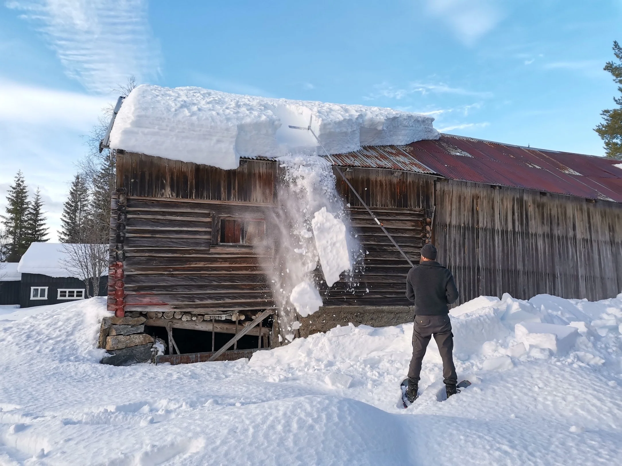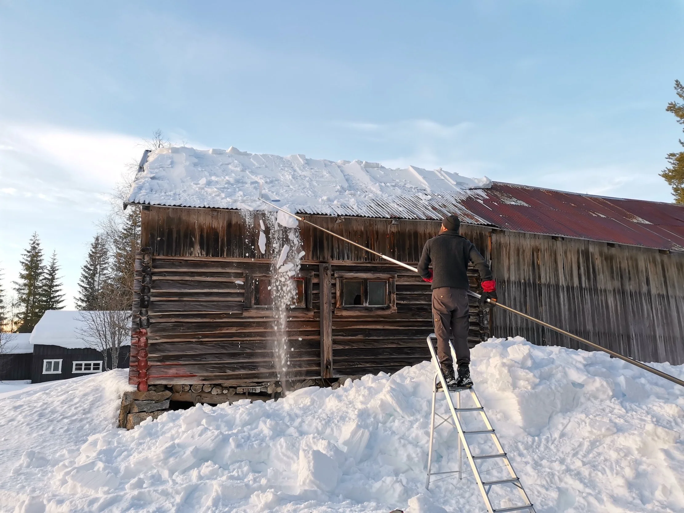 Snømåking av taket på en gammel låve utført fra bakkenivå.