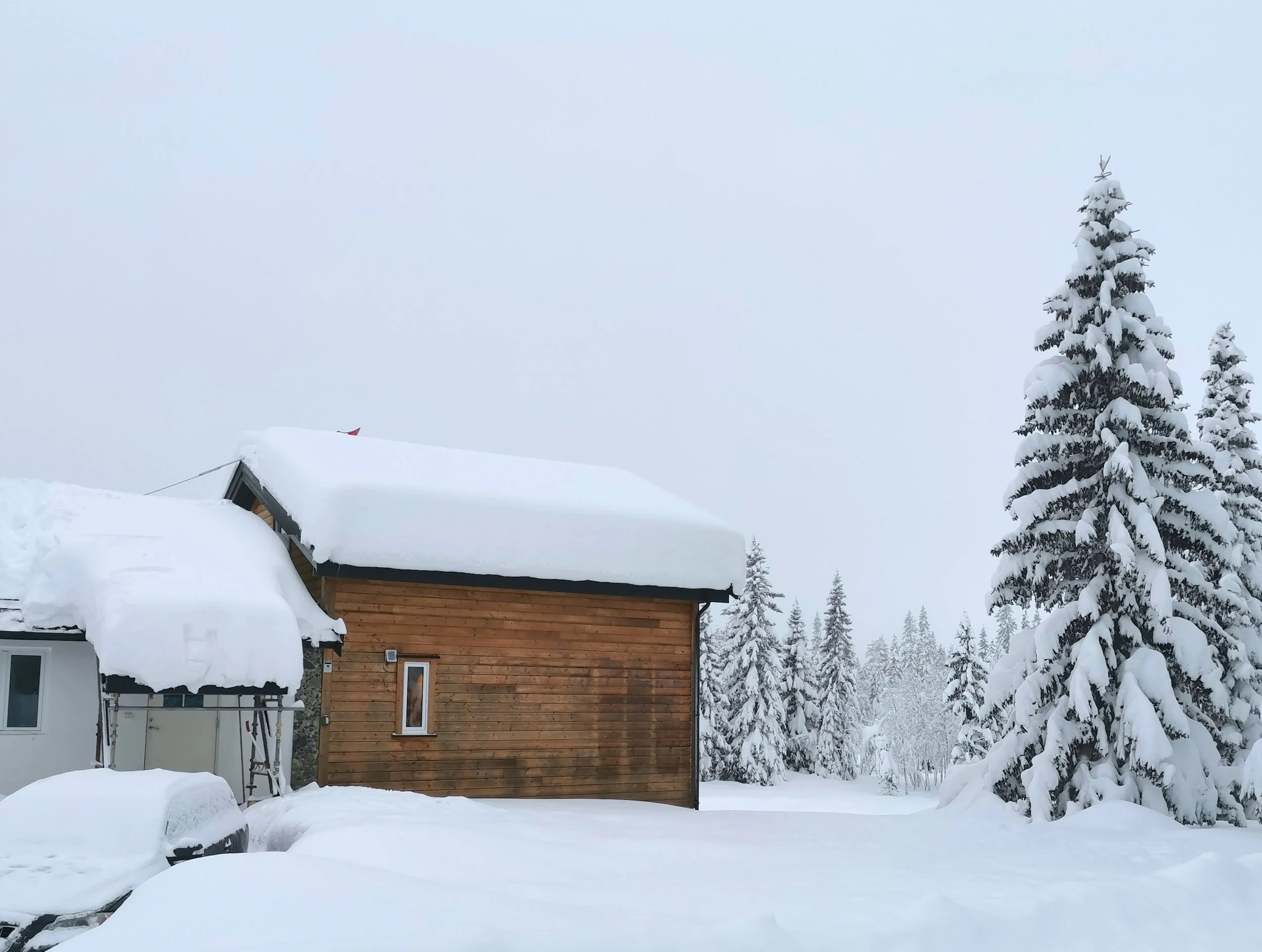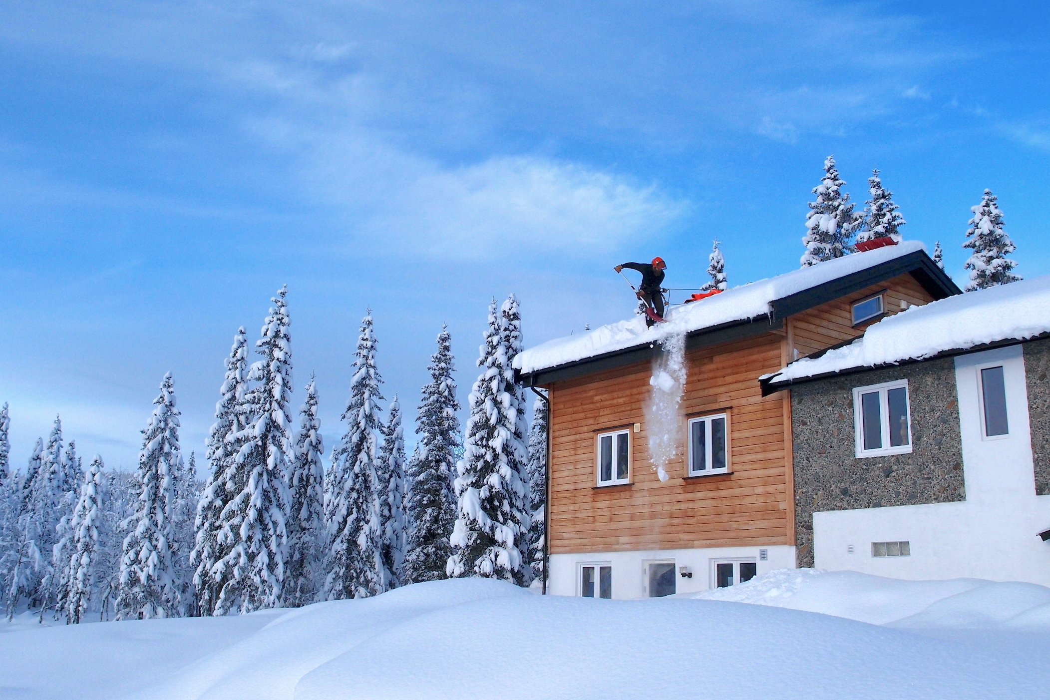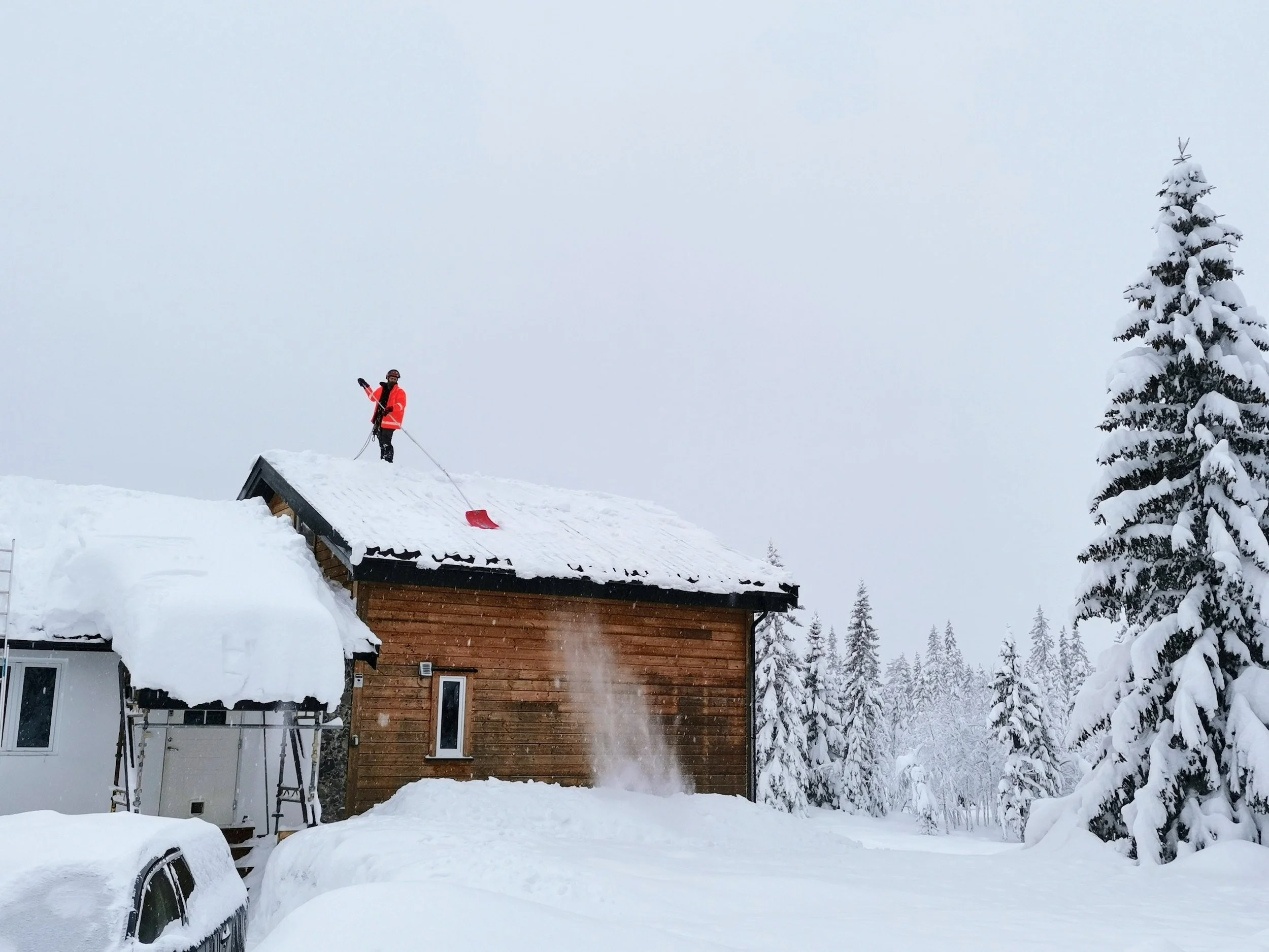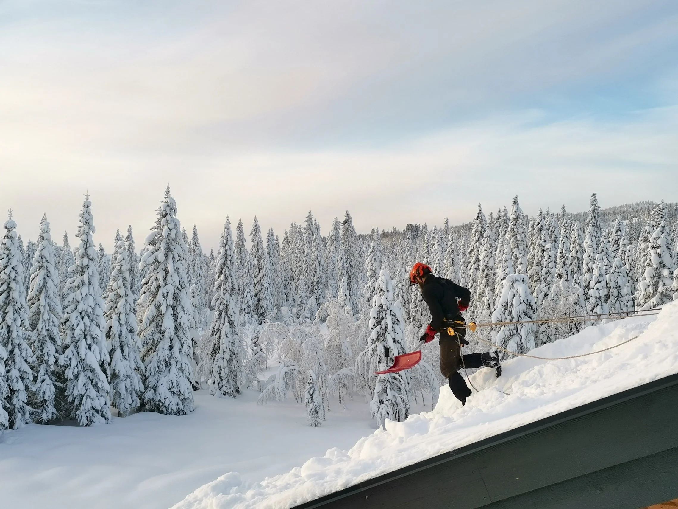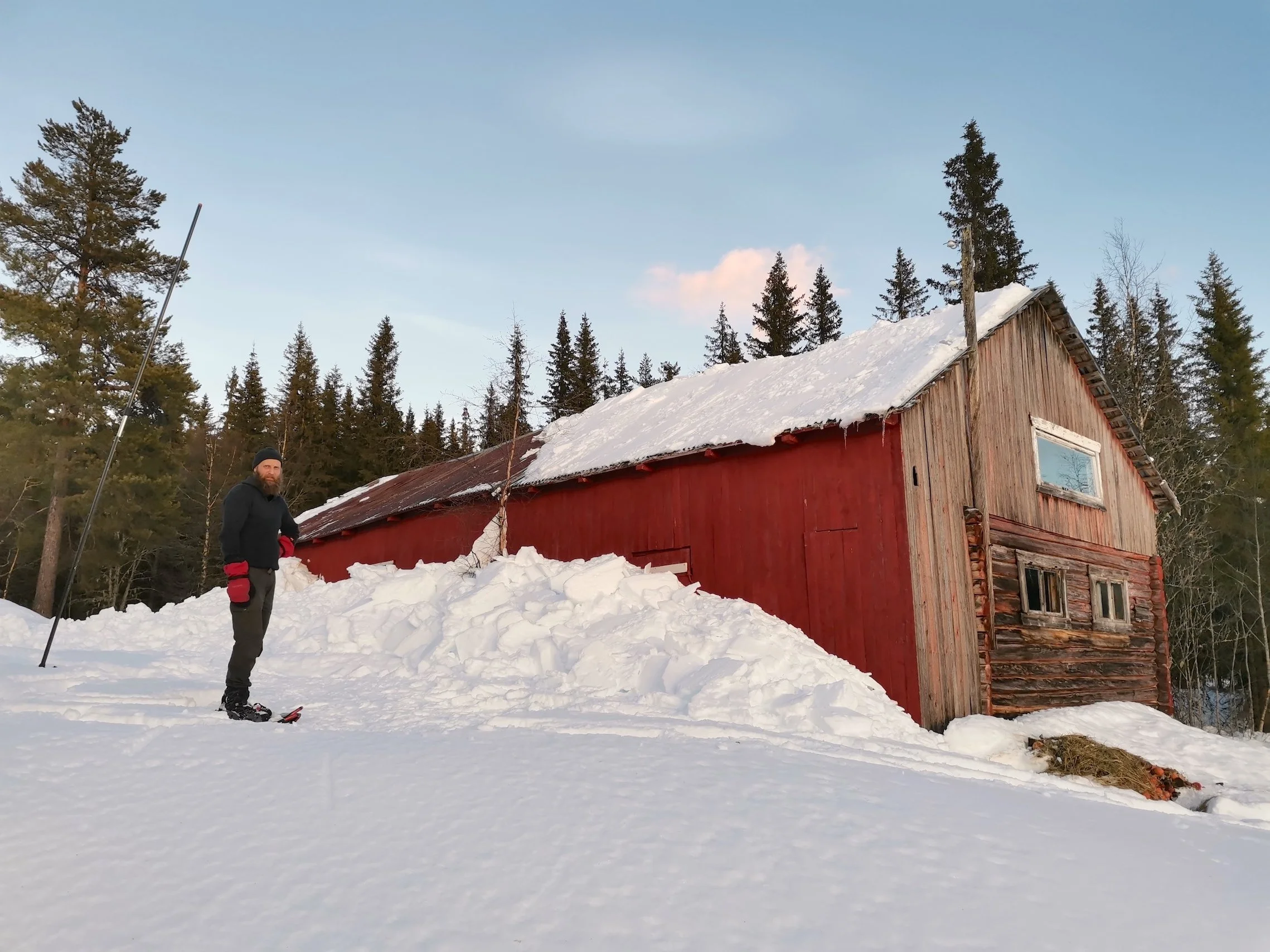 Snømåking av taket på en gammel låve utført fra bakkenivå.