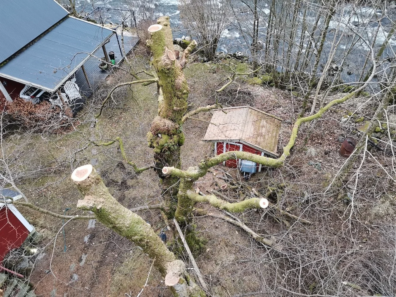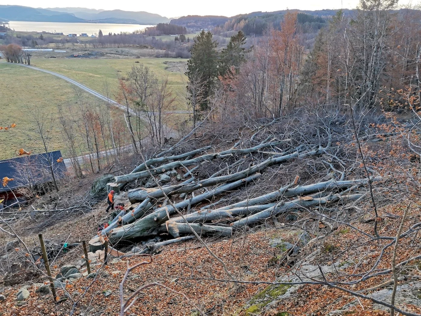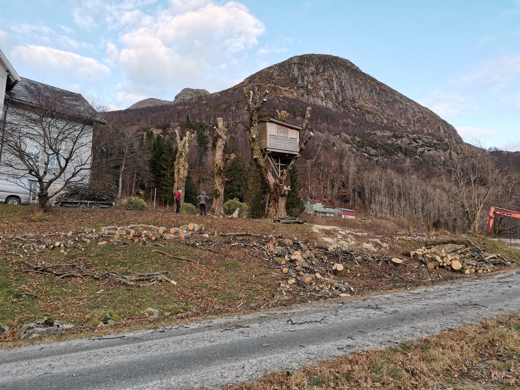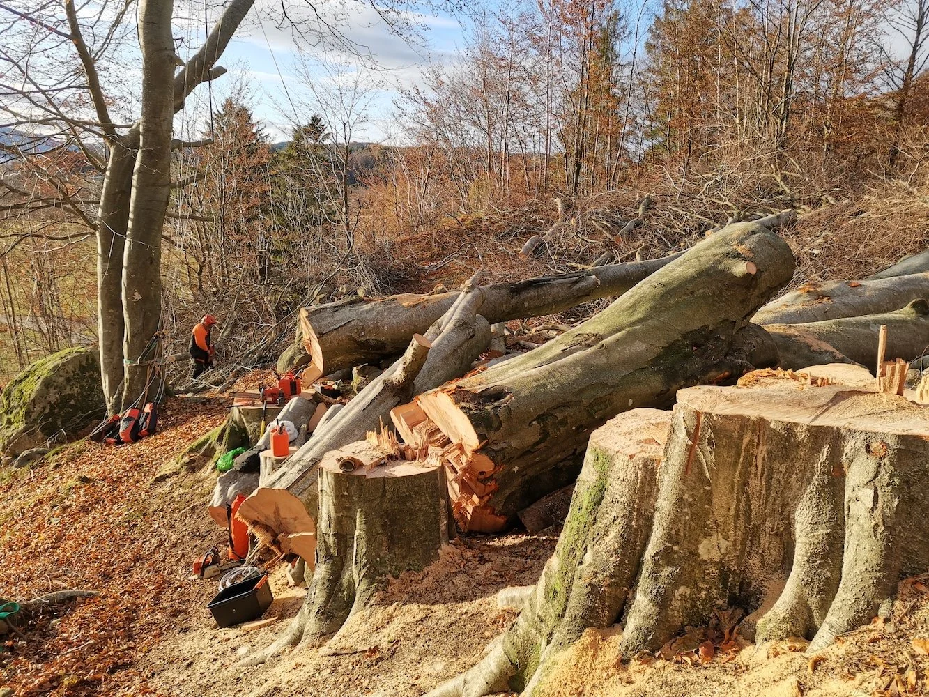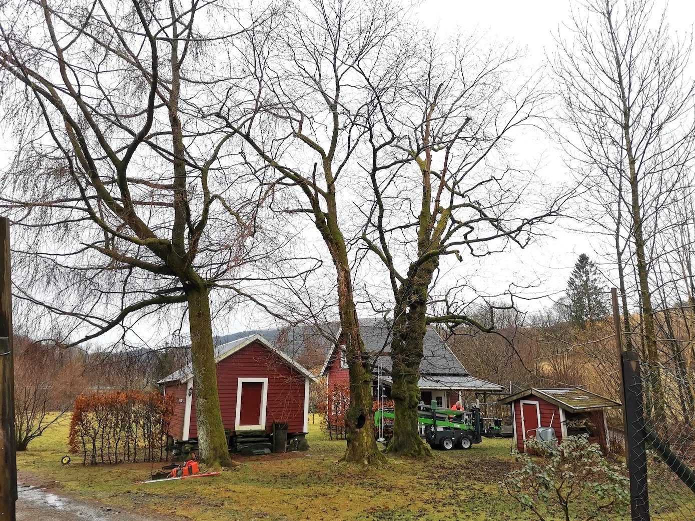 Felling av store bøketrær på et gårdsbruk.