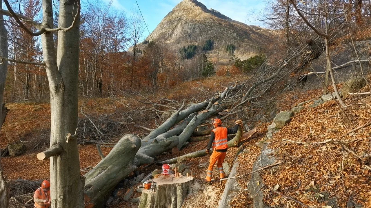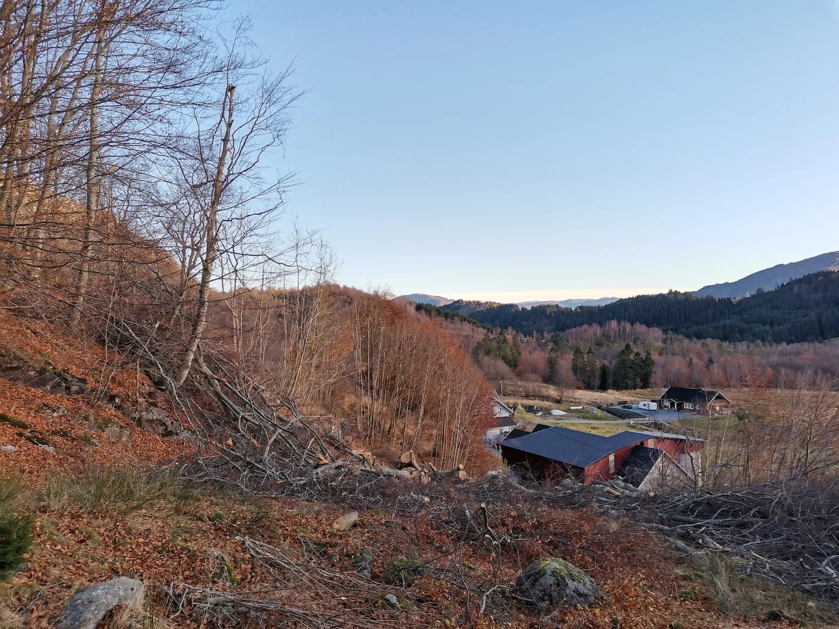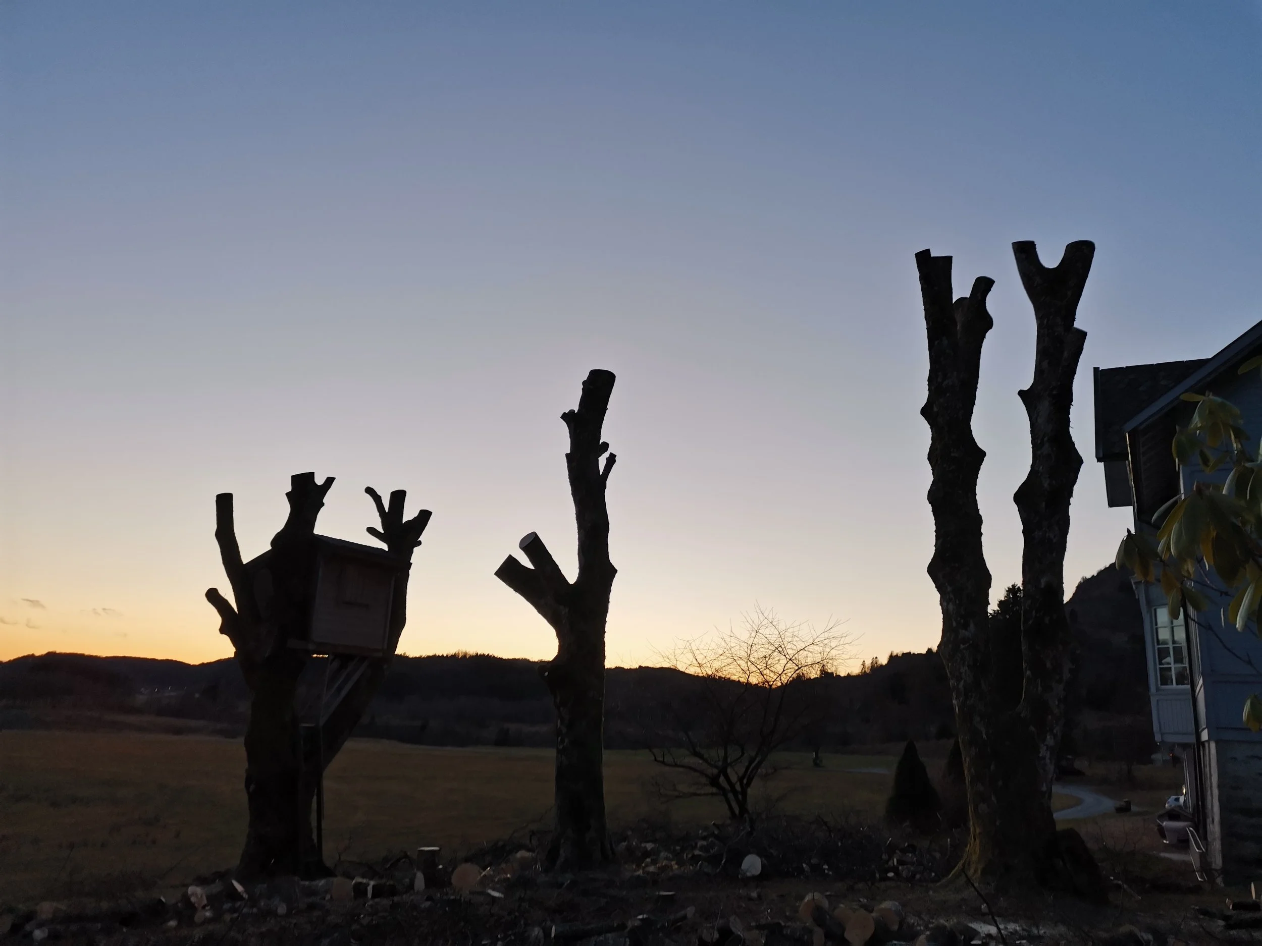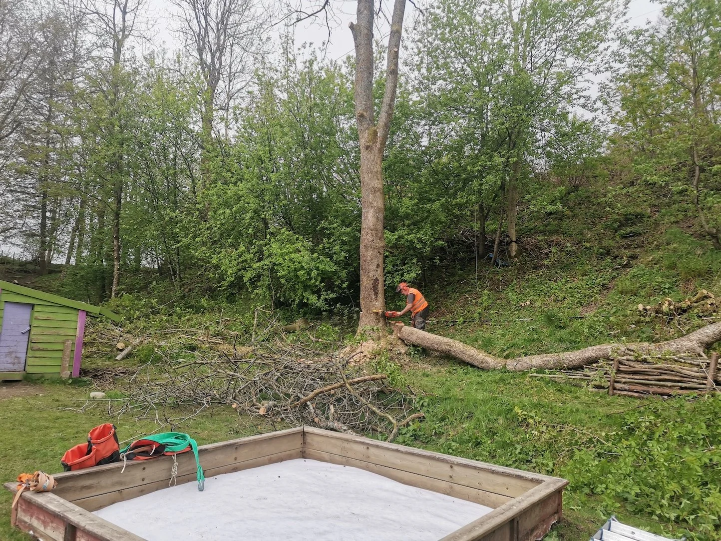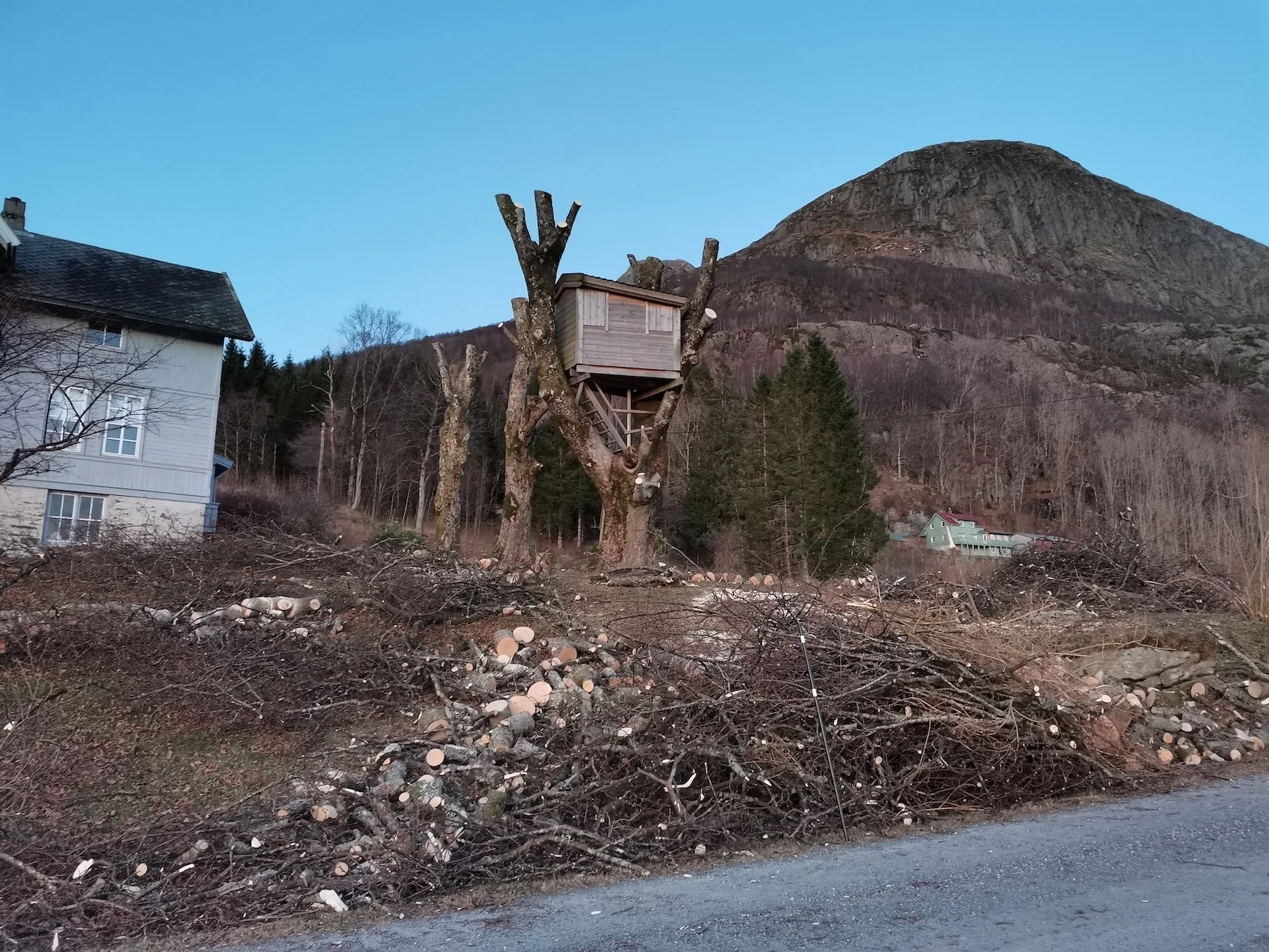 Felling av store bøketrær på et gårdsbruk.