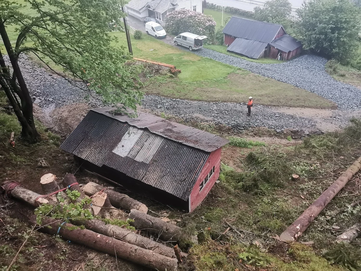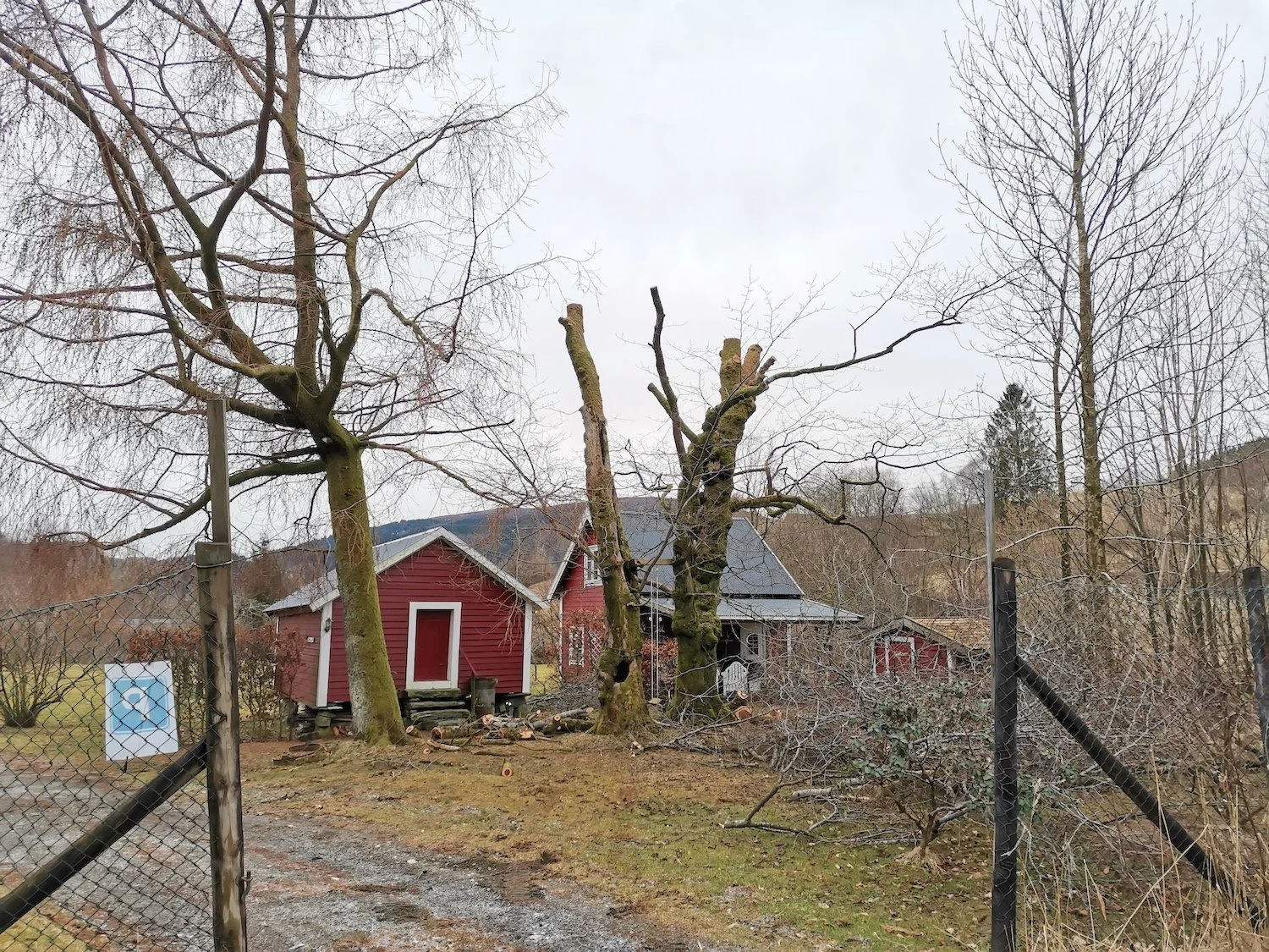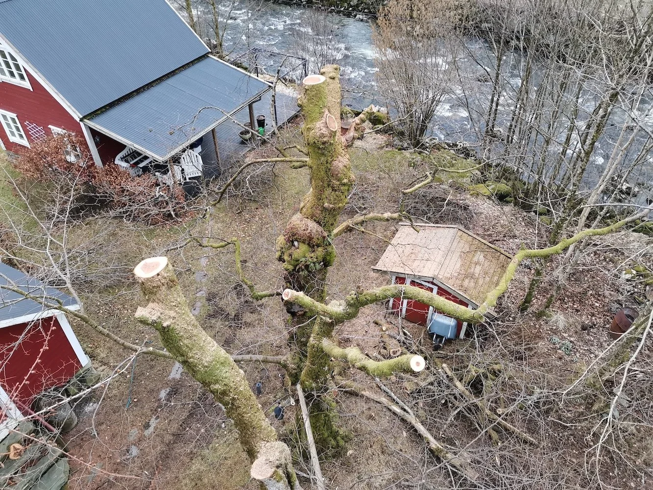 Felling av store grantrær på et gårdsbruk.