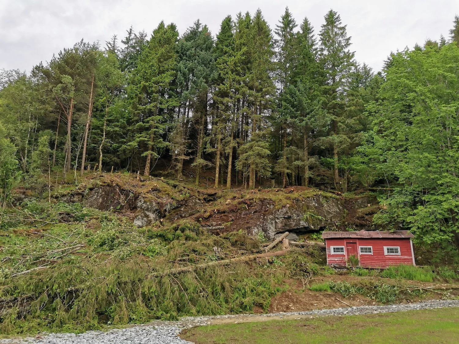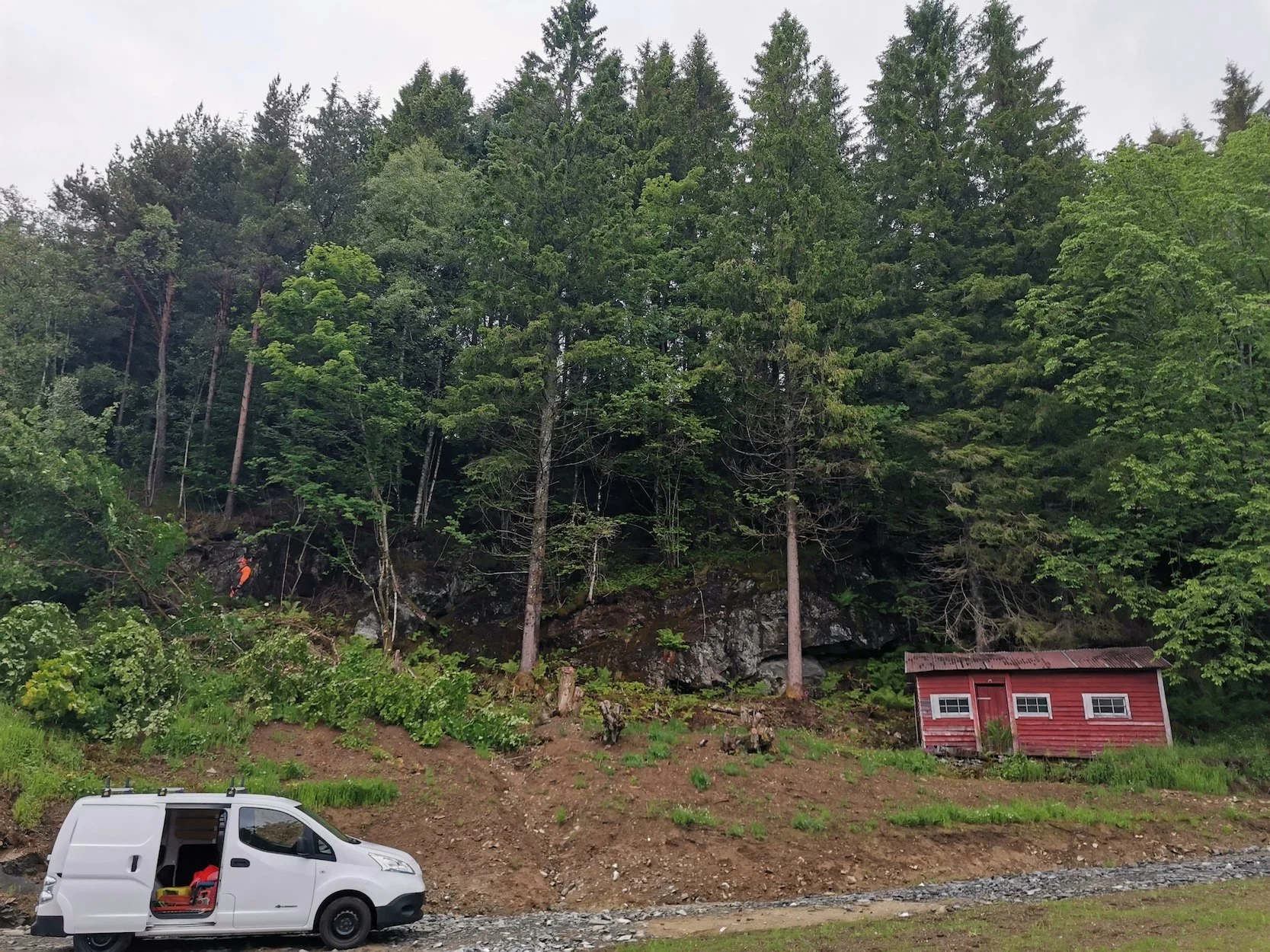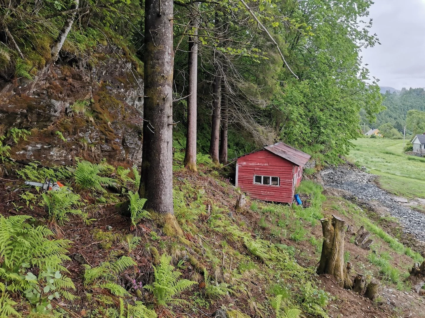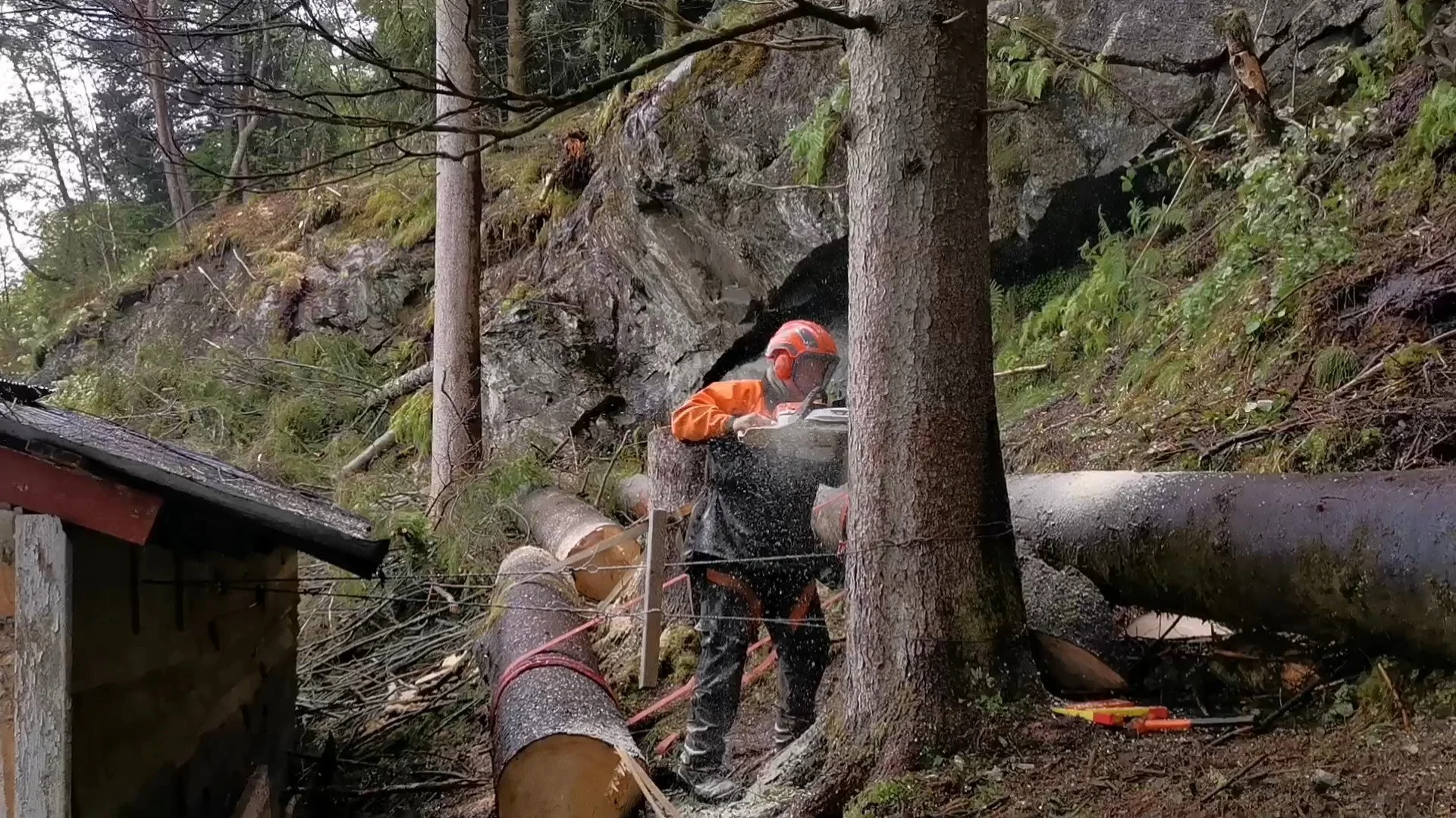 Felling av store grantrær på et gårdsbruk.