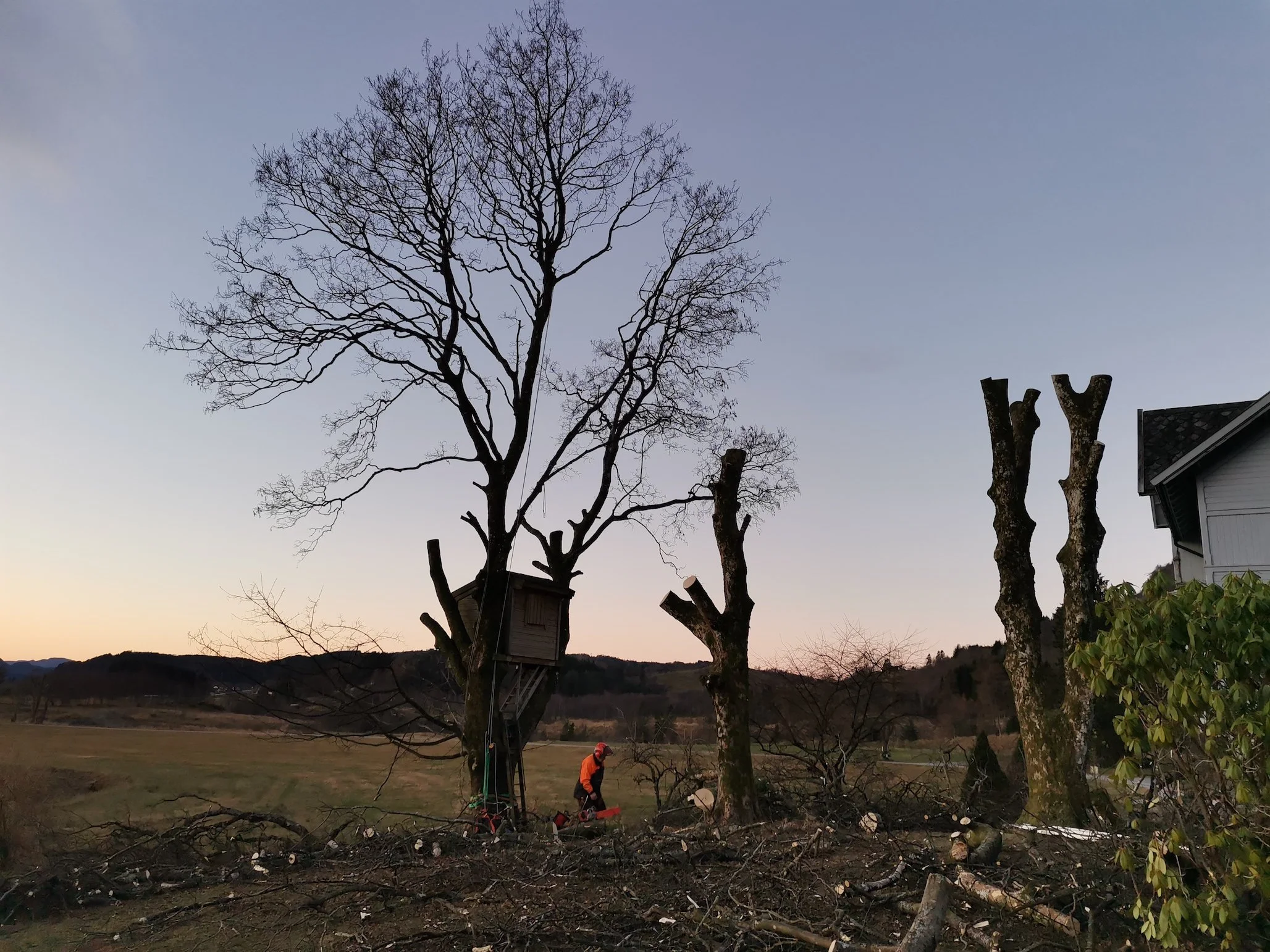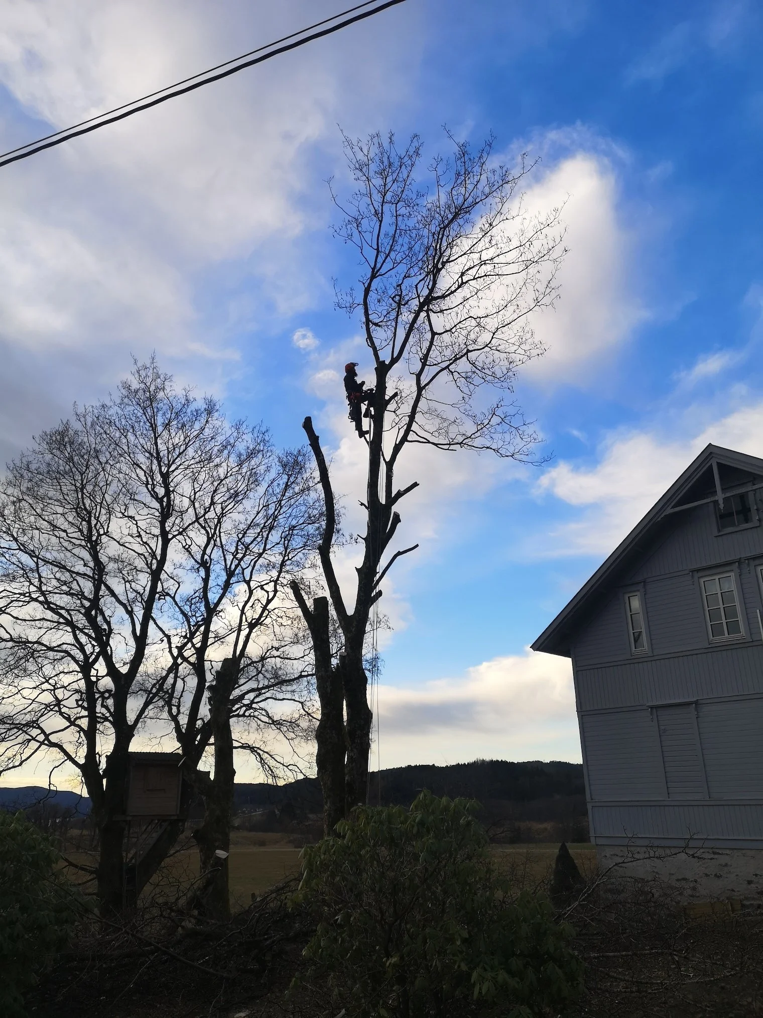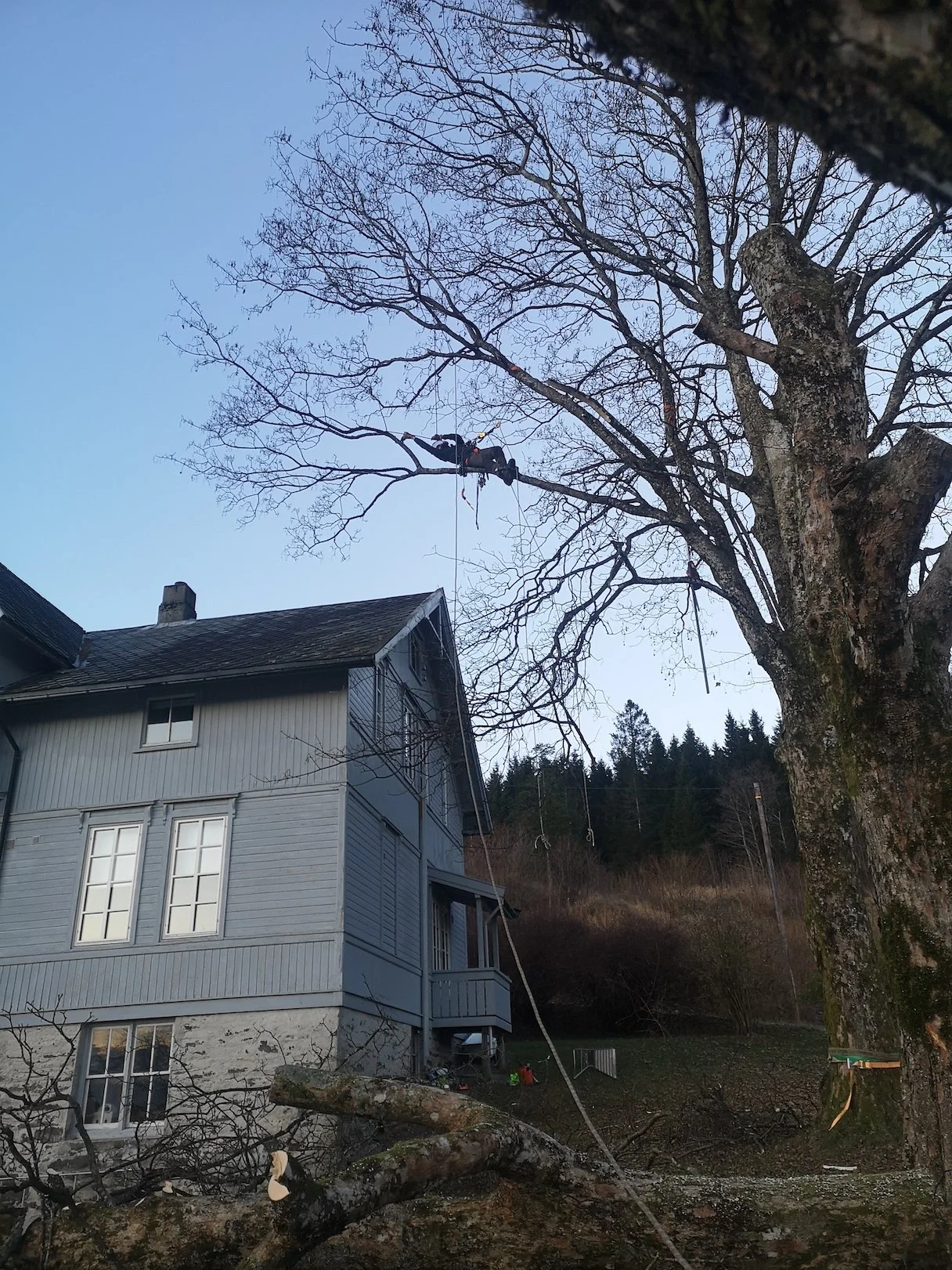 Styving av lønnetrær på et gårdsbruk vha. klatring.