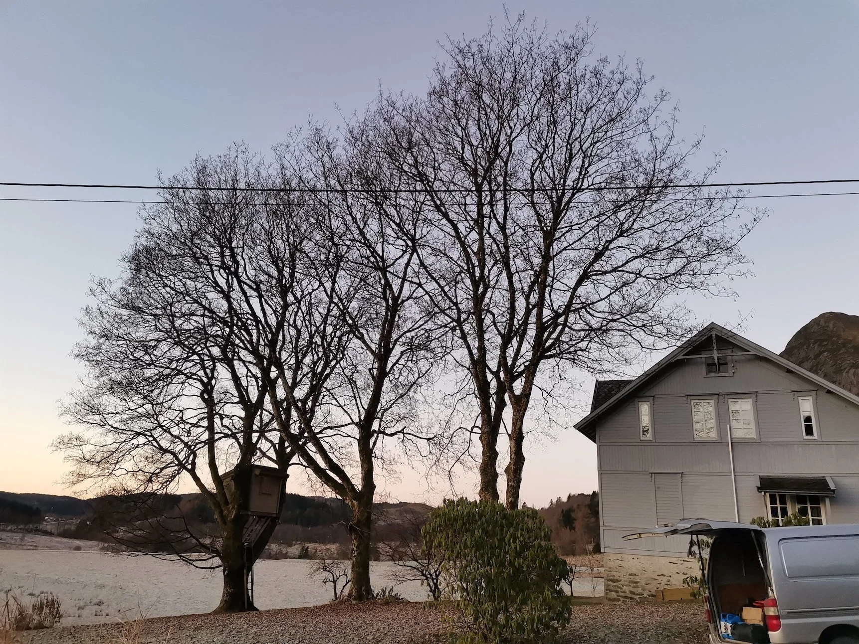 Beskjæring av almetrær vha. lift på privat eiendom. Trærne var i dårlig forfatning med mange skader og råte. I et forsøk på å bevare trærne, etter kundens ønsker, ble trærne redusert en god del.