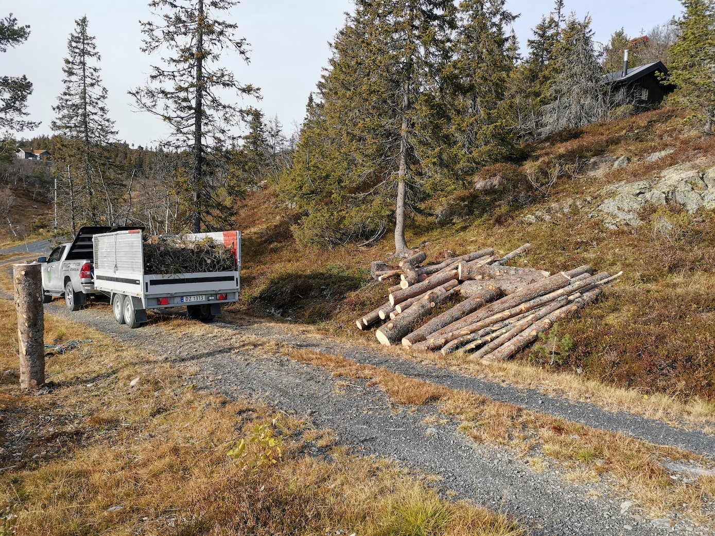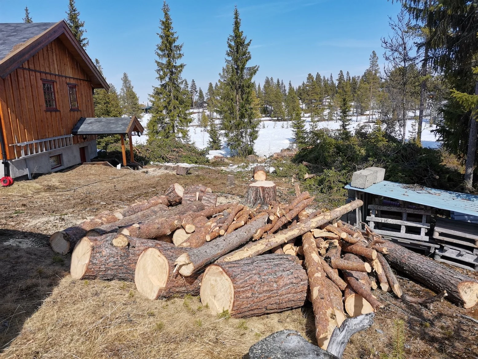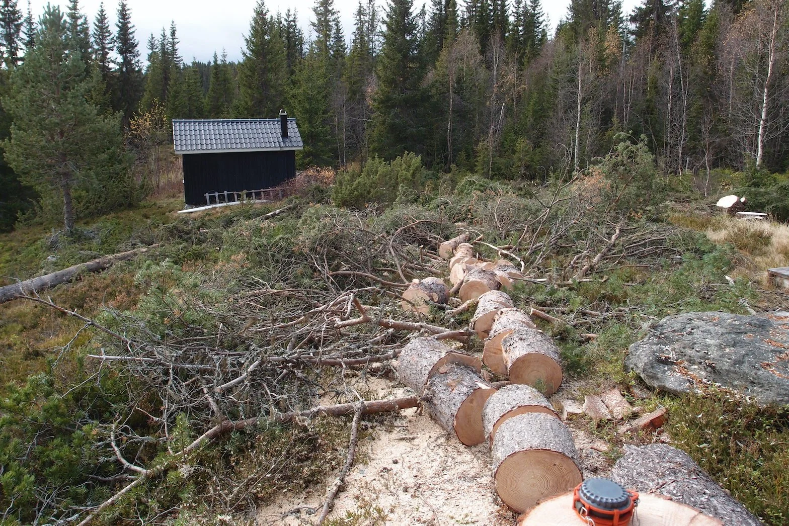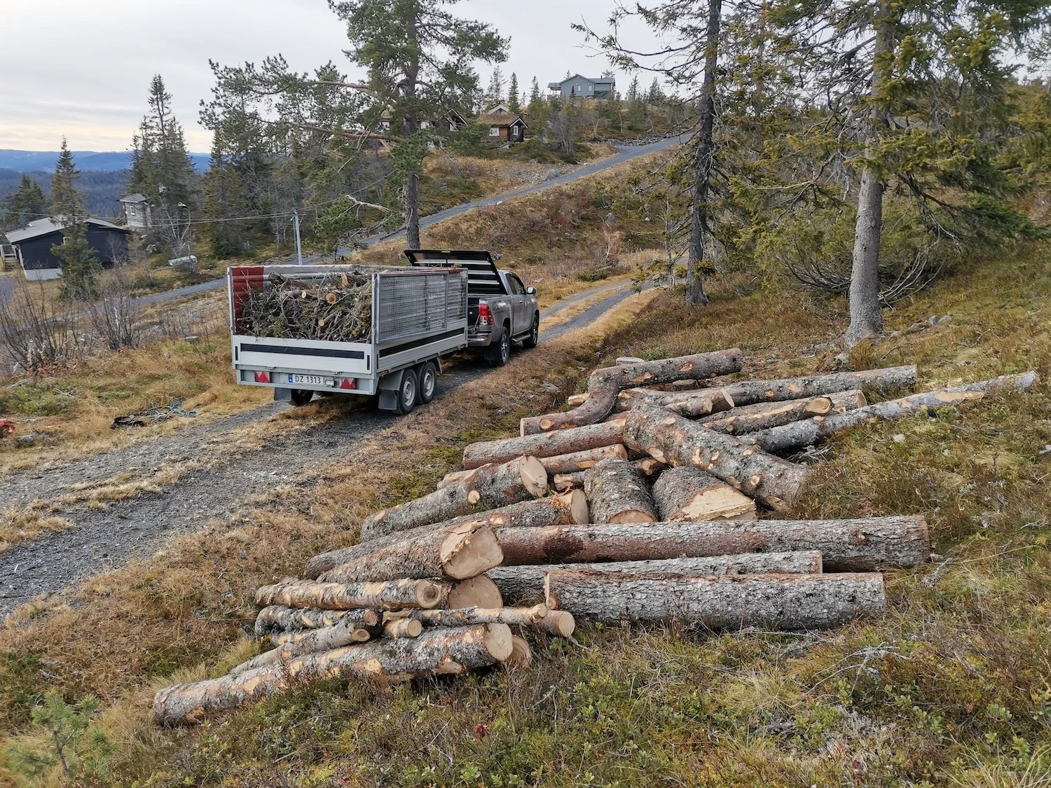 Felling, kvisting, flishugging og bortkjøring av over 100 furutrær for å gi bedre lysforhold og utsikt på hyttetomt.