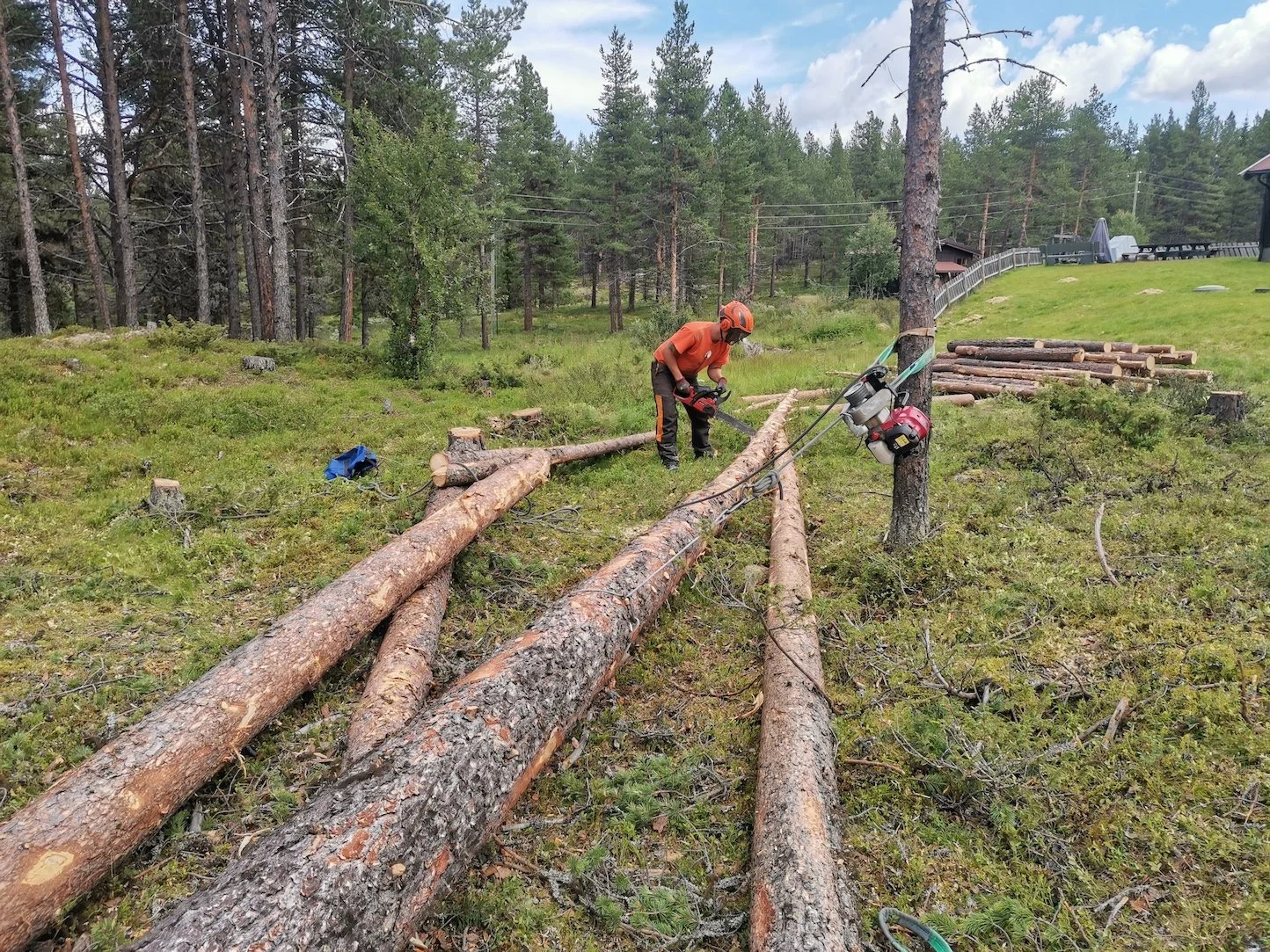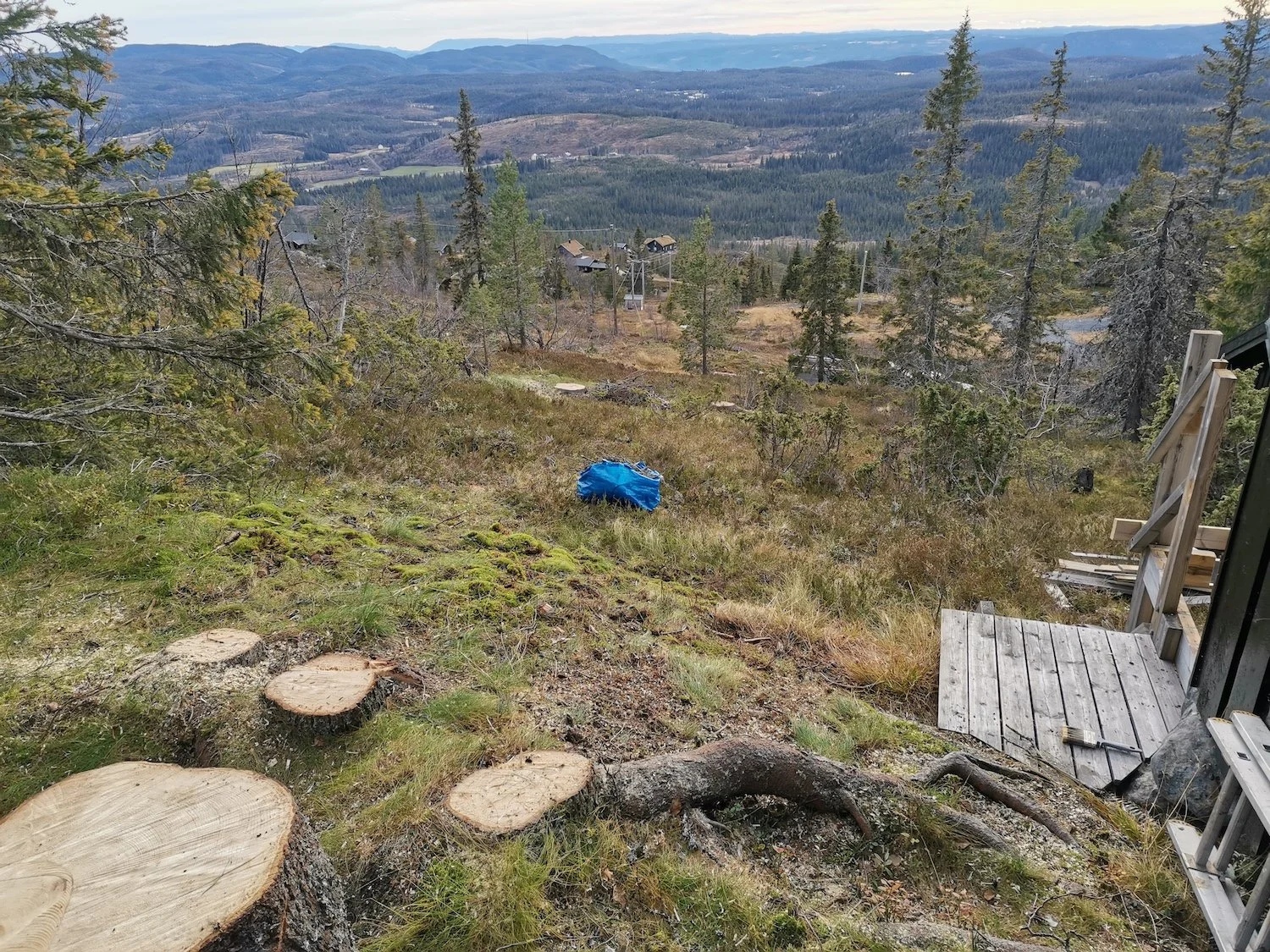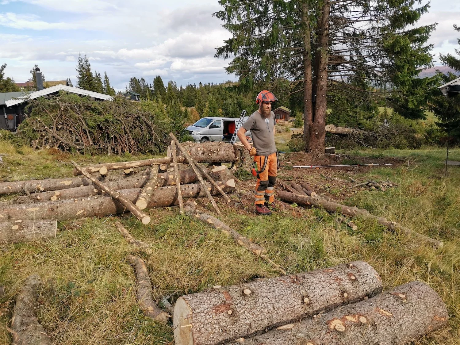 Felling, kvisting, flishugging og bortkjøring av over 100 furutrær for å gi bedre lysforhold og utsikt på hyttetomt.