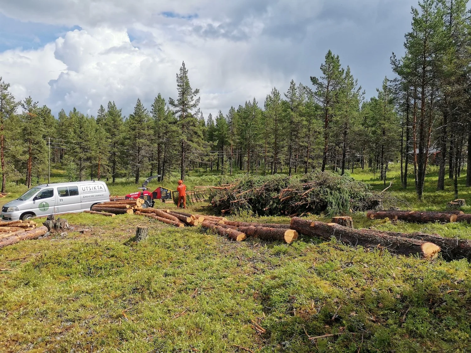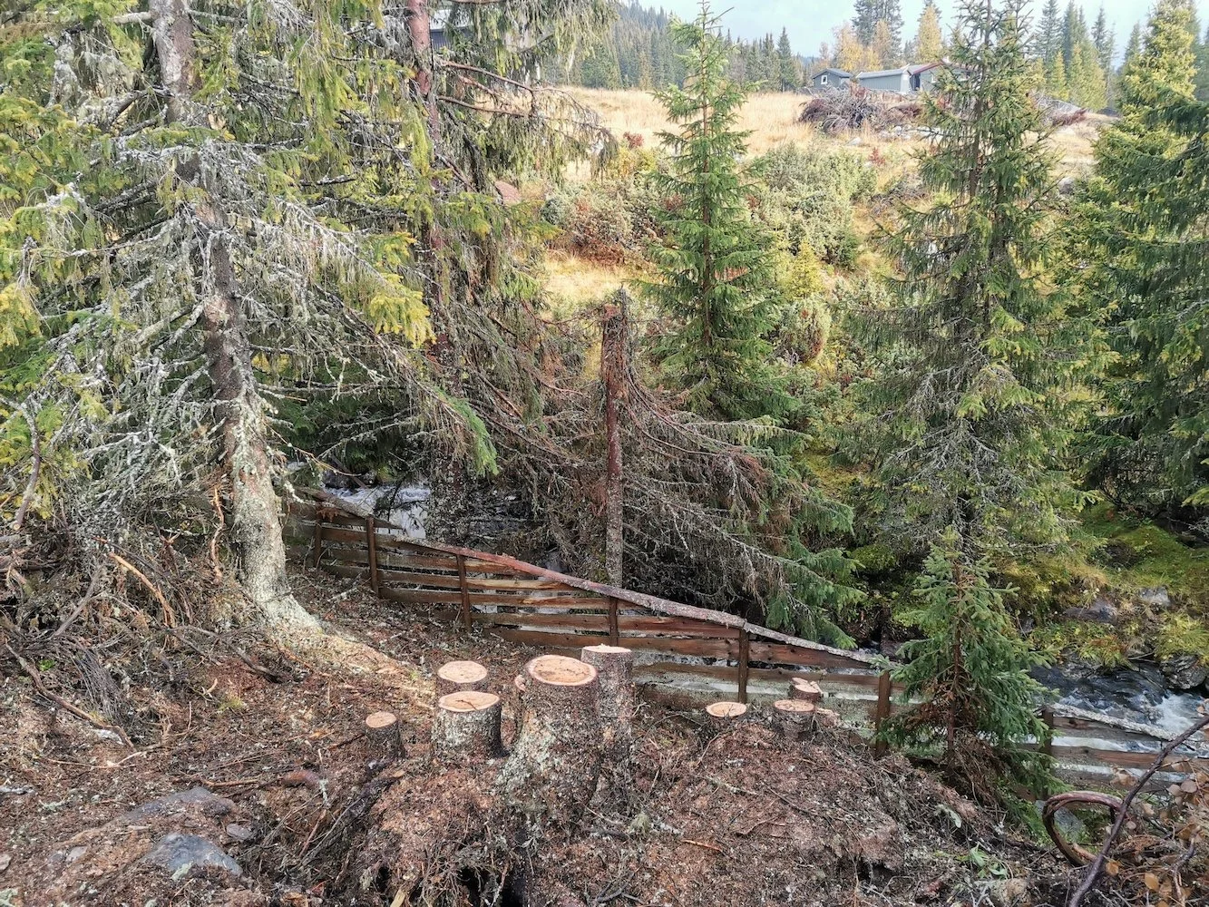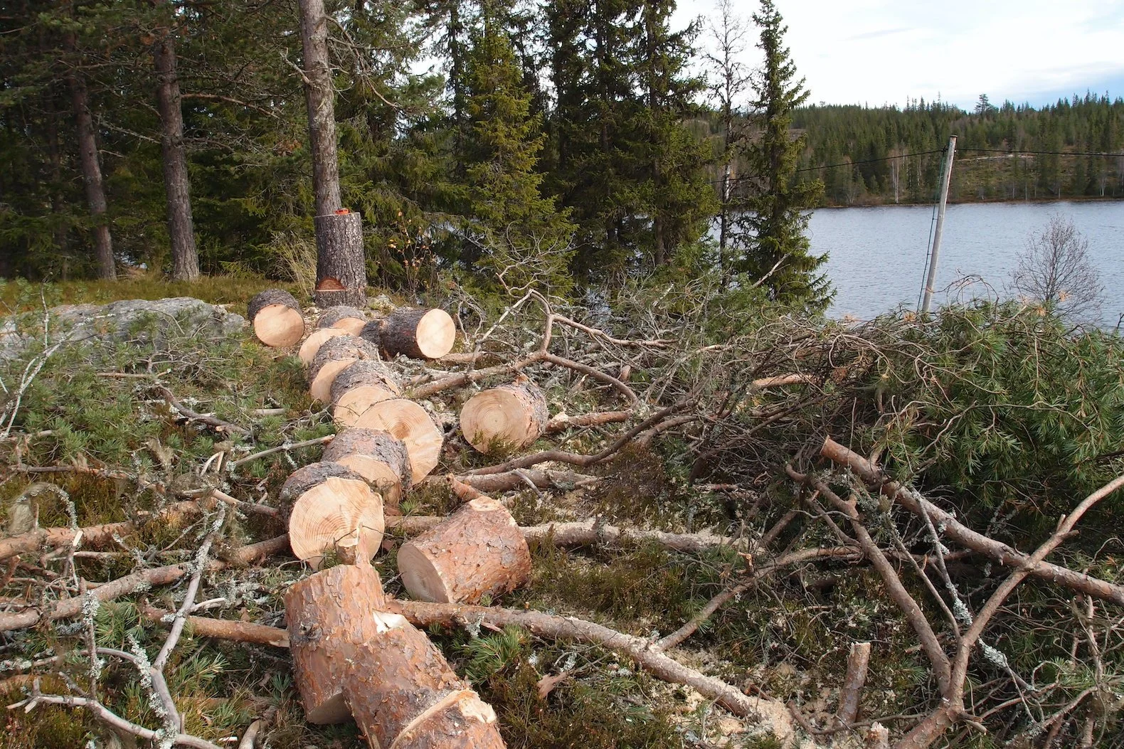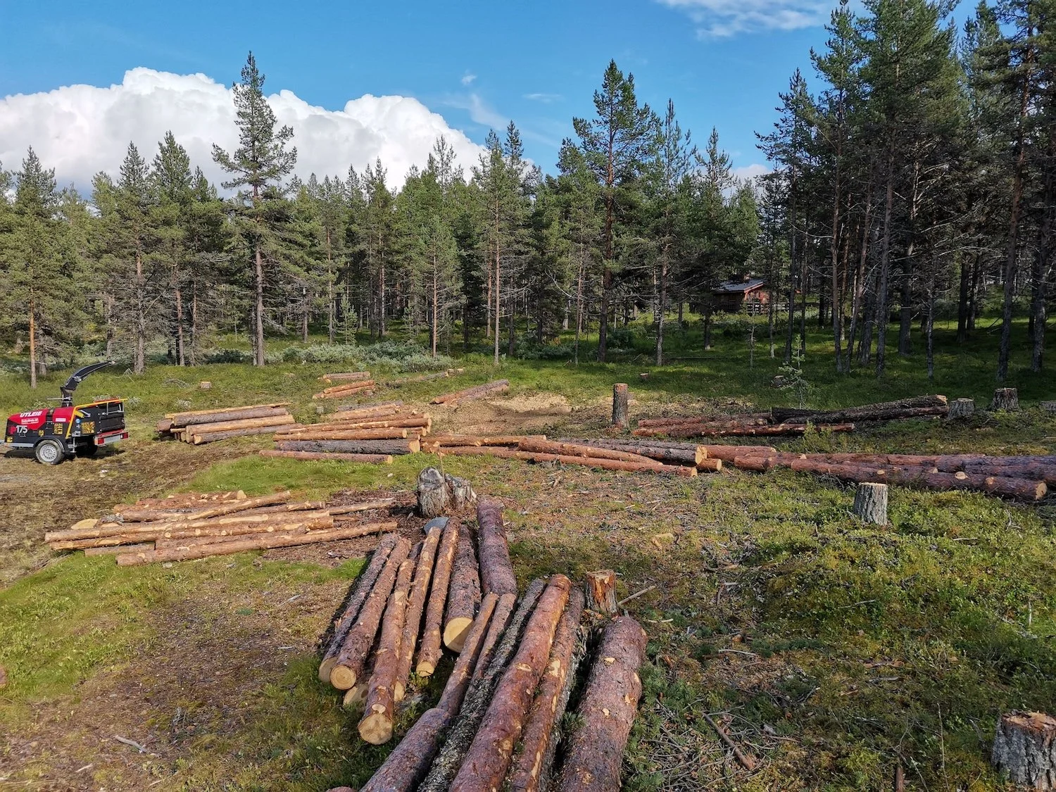 Felling av grantrær og bortkjøring av granbar på hyttetomt.