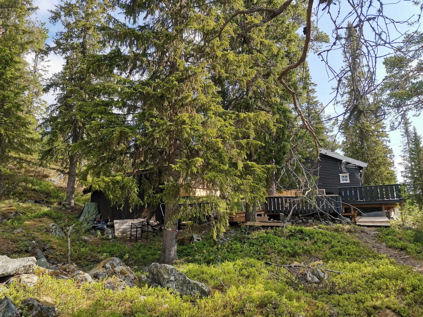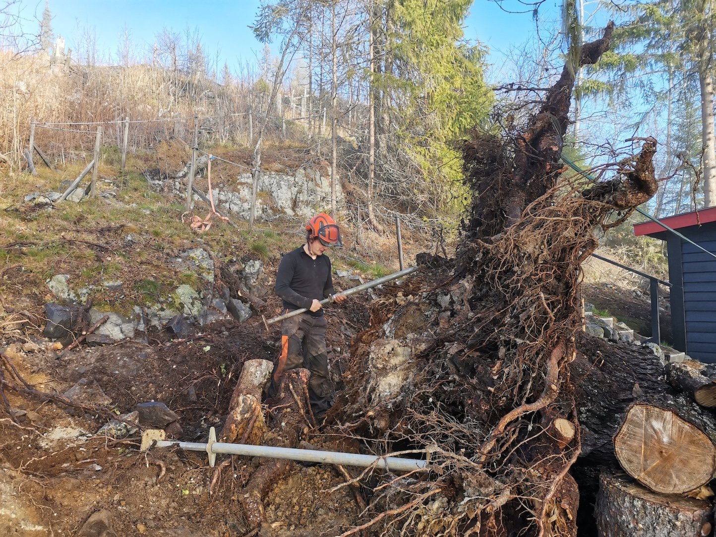 Opprydding etter vindfall og manuell fjerning av røtter på hyttetomt uten veiforbindelse.