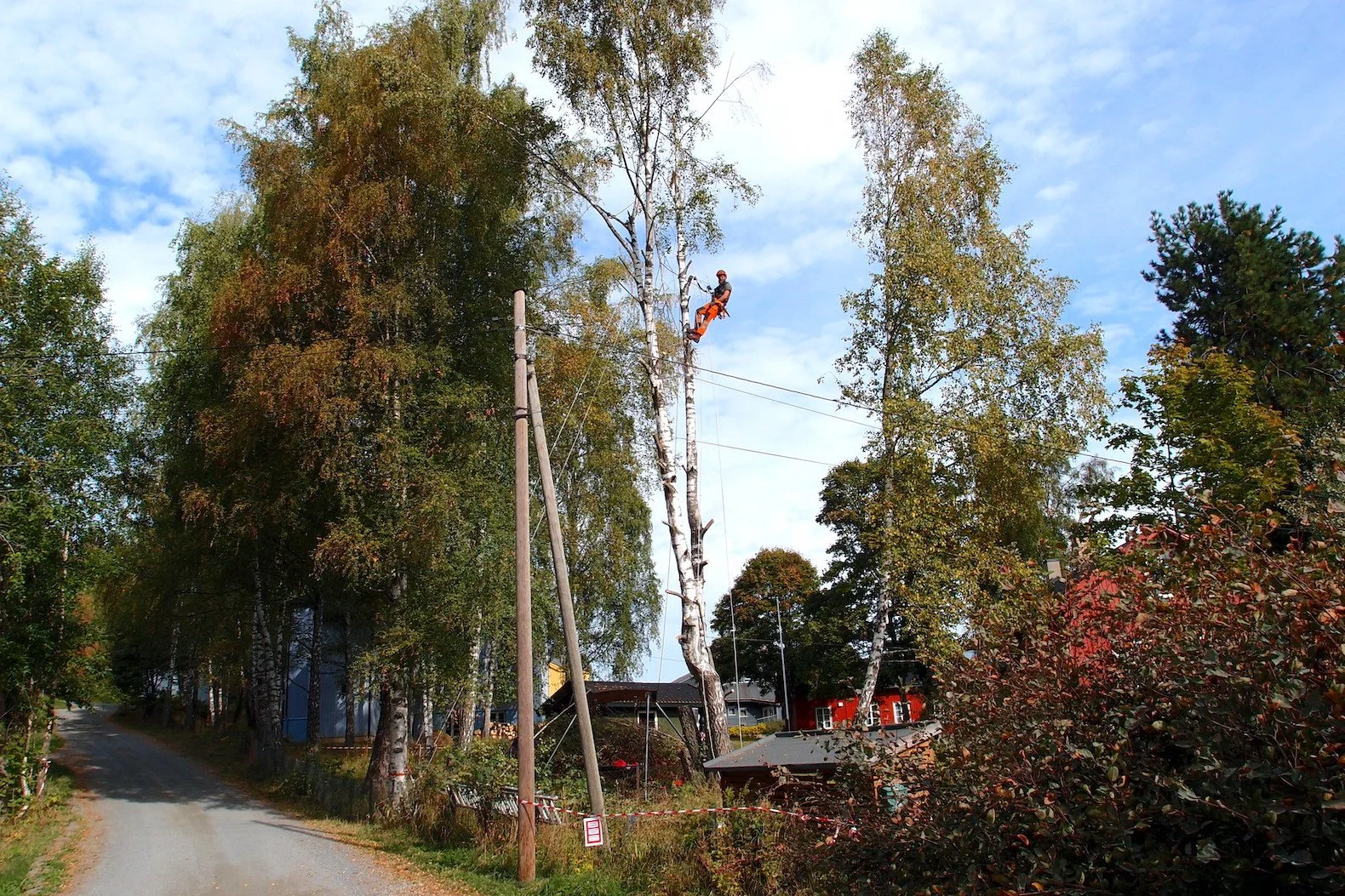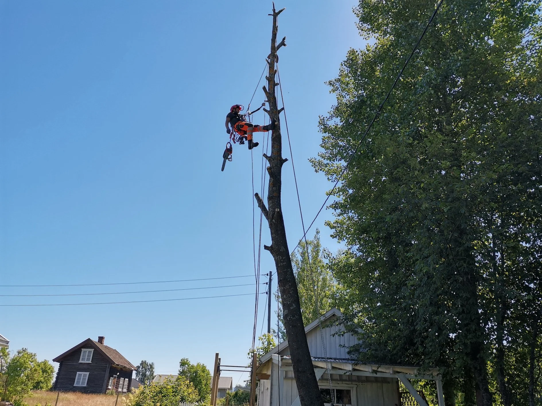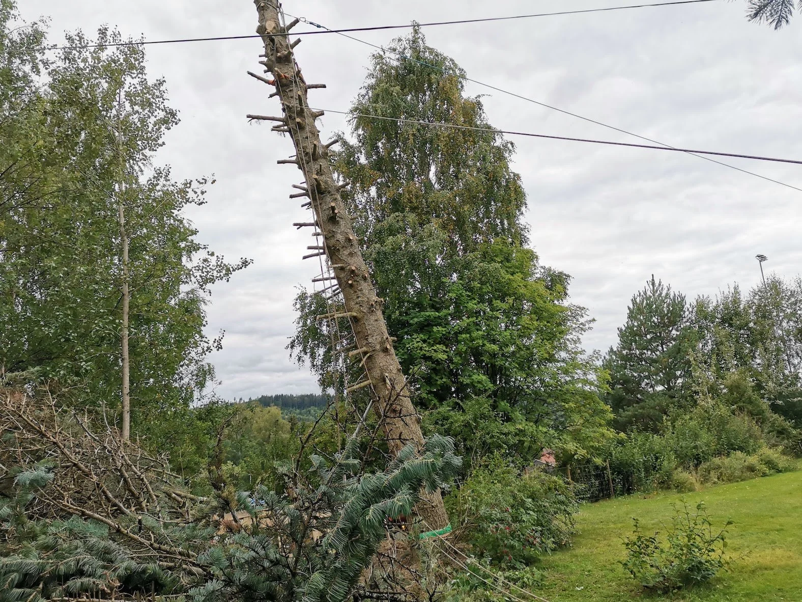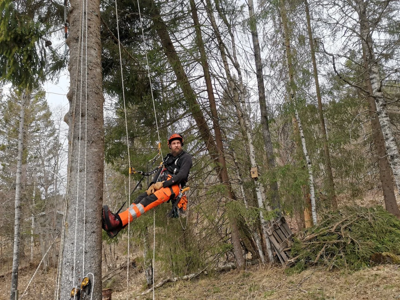 Seksjonsfelling av gran- og bjørketrær vha. klatring.