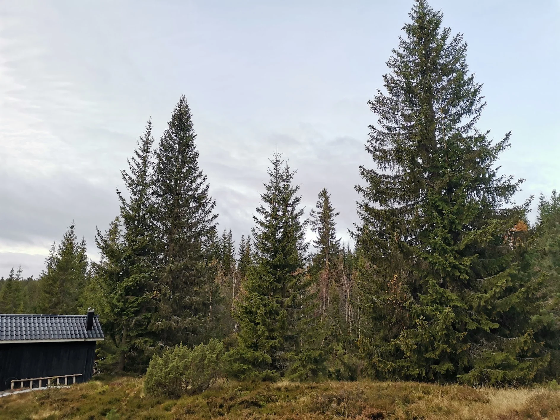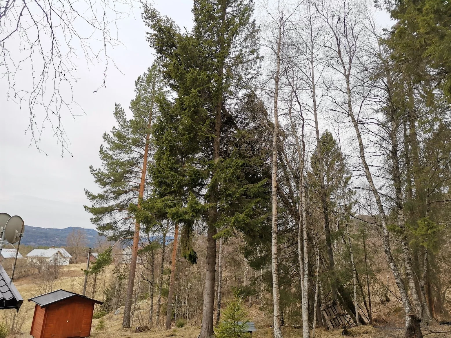 Felling, kvisting og oppkapping av grantrær på hyttetomt.