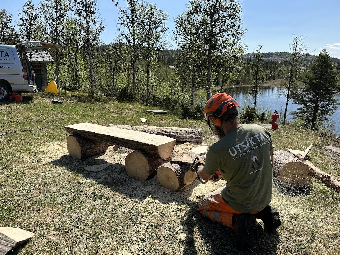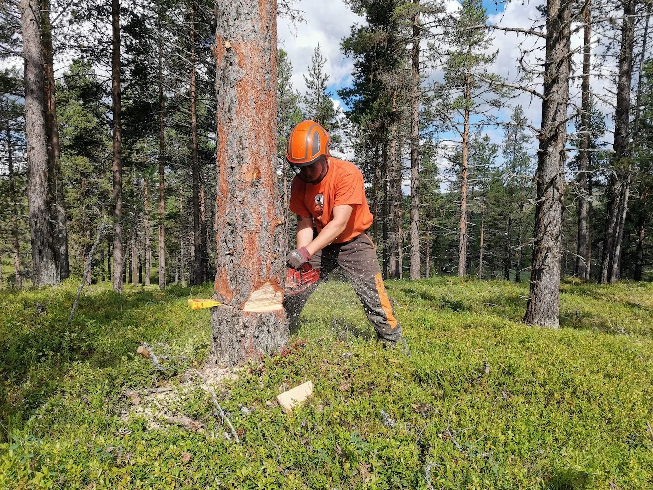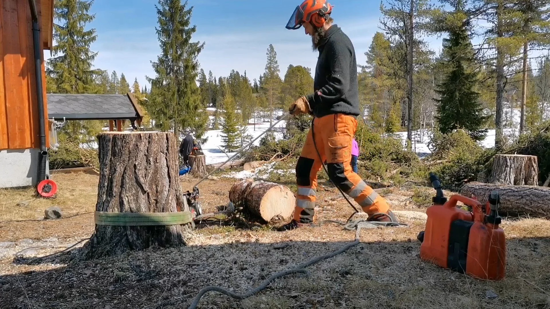 Felling av furutre, der kunde ønsket å bruke deler av stammen til å lage utemøbler.