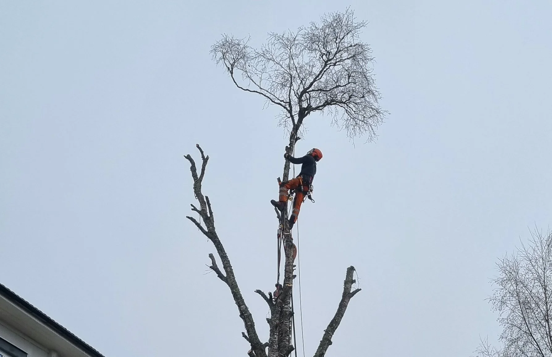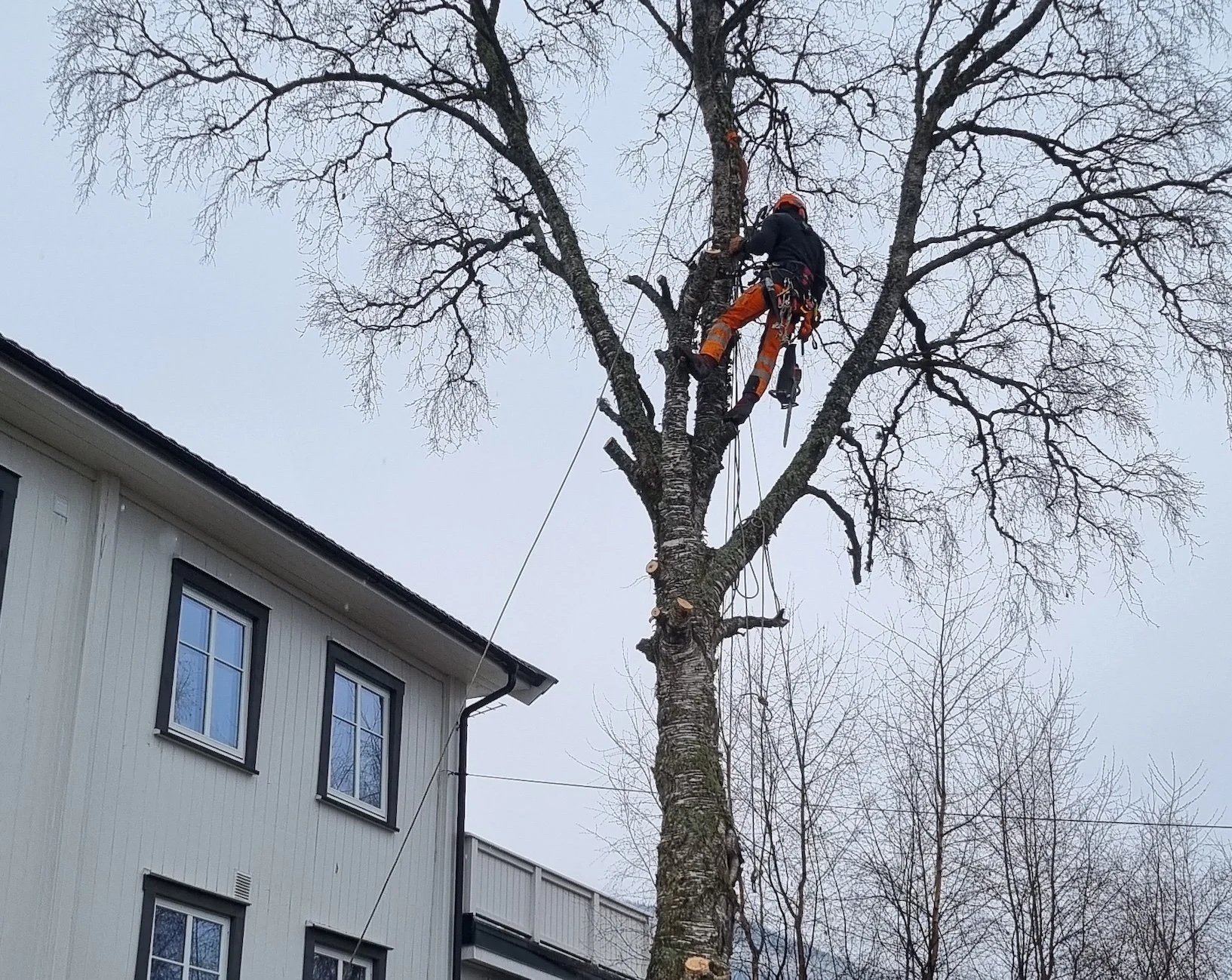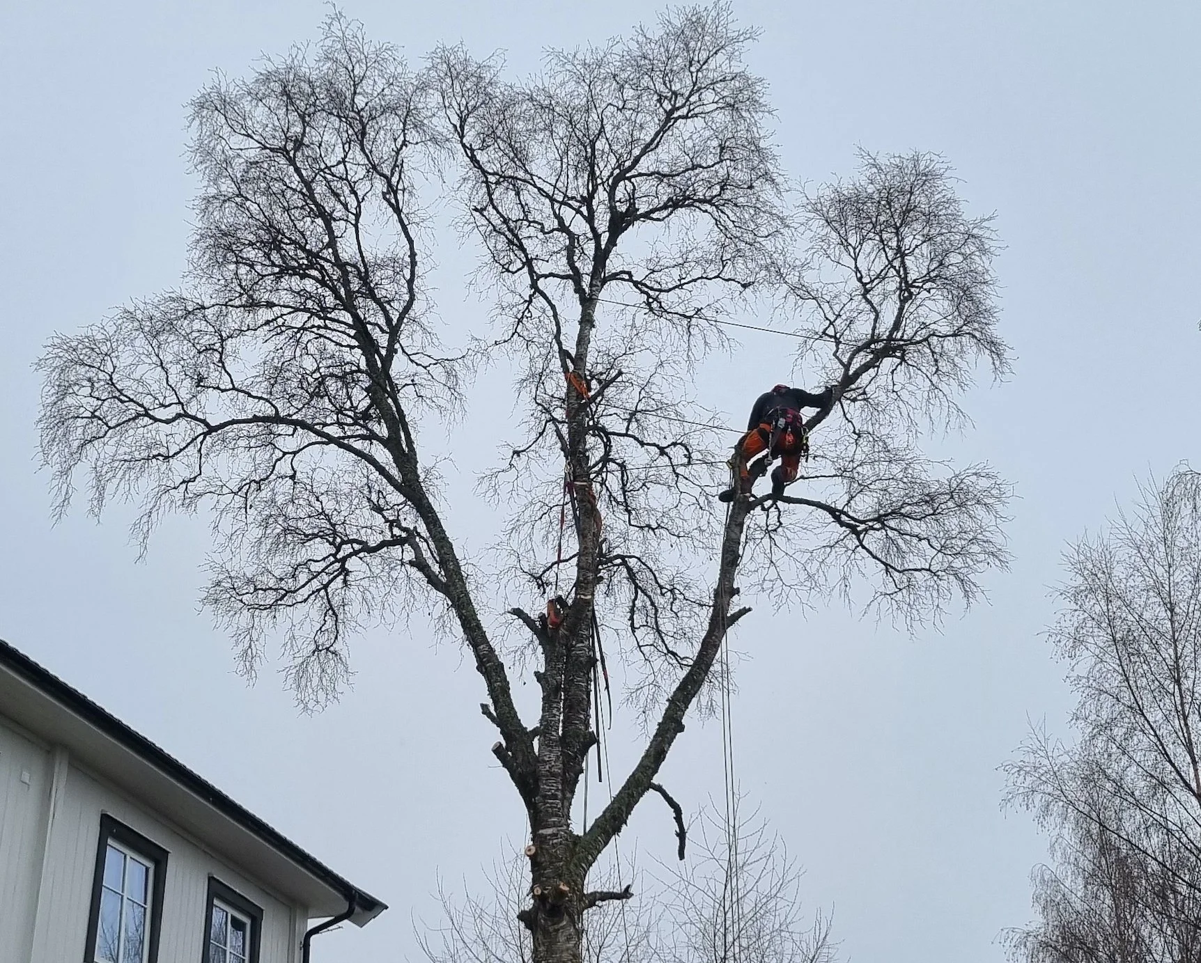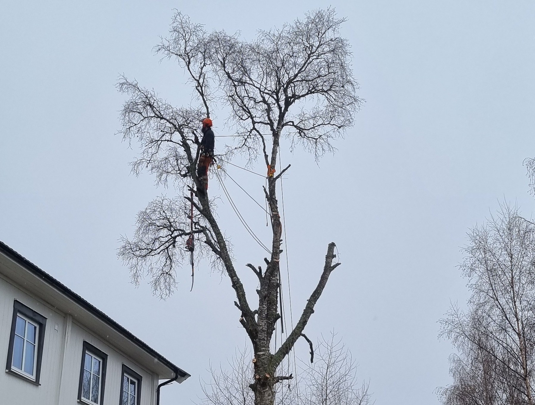 Seksjonsfelling av bjørk vha. klatring på hustomt.