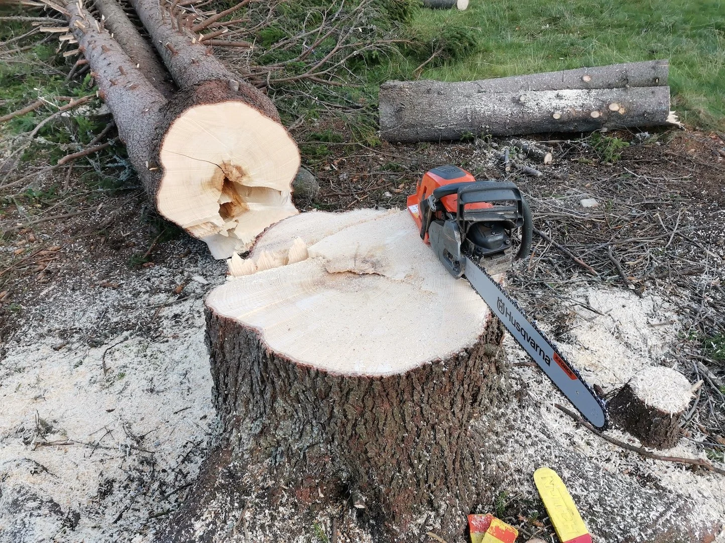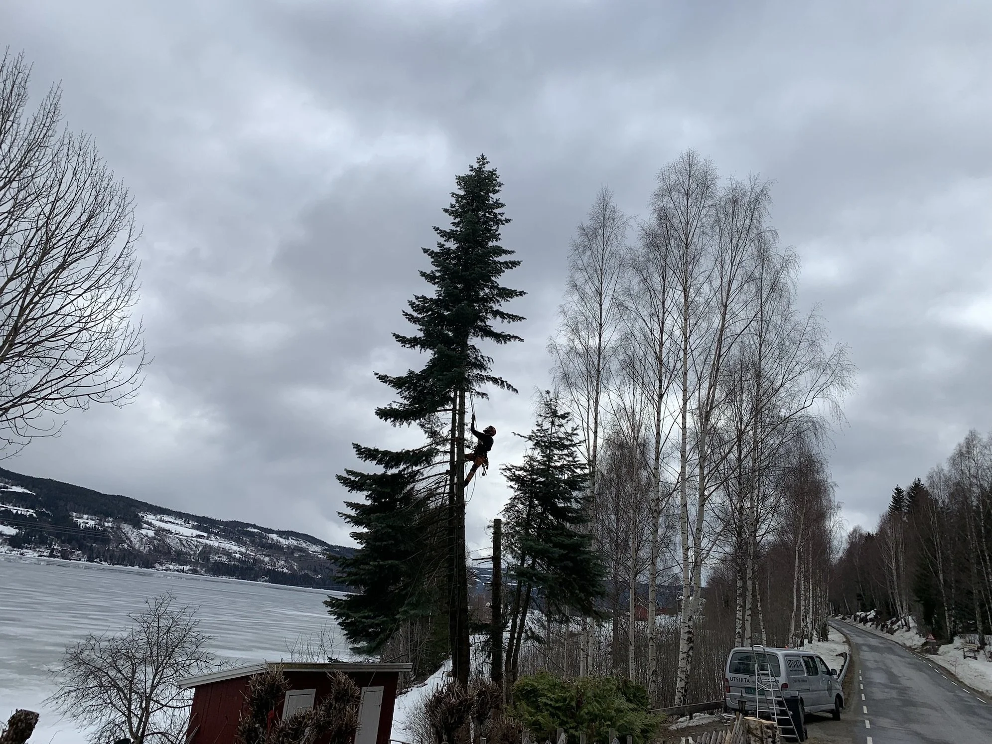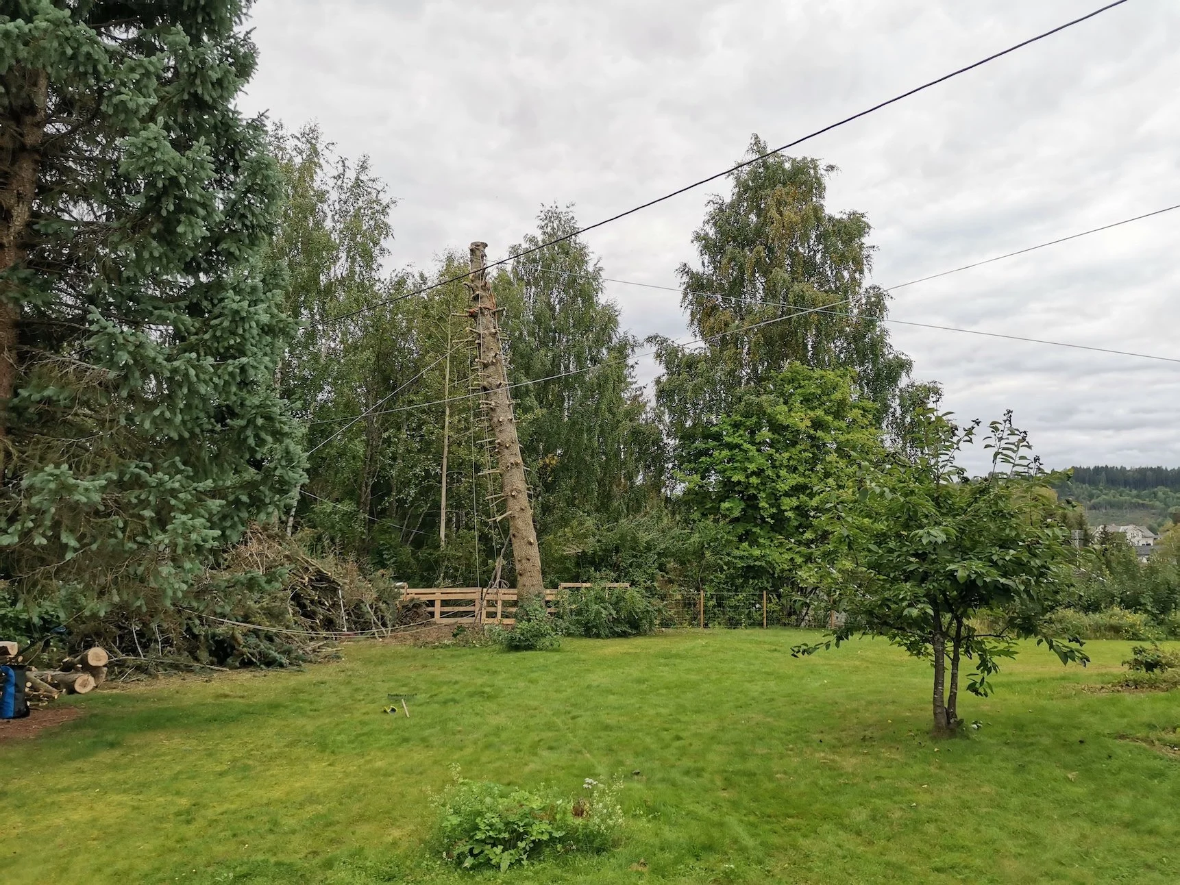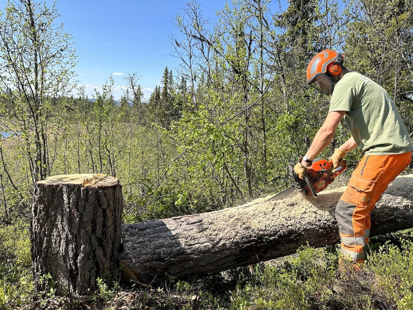 Felling av grantrær i dårlig forfatning på hyttetomt.