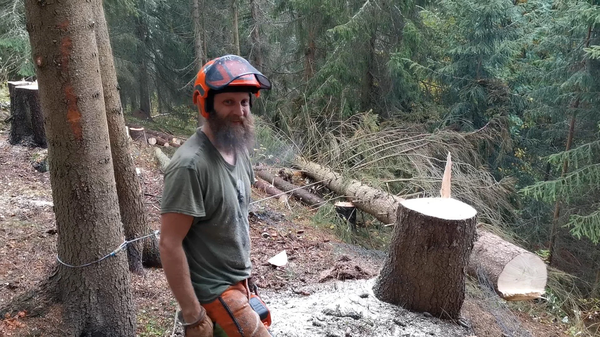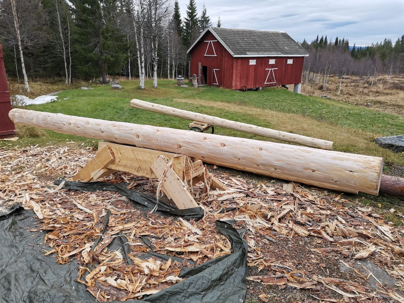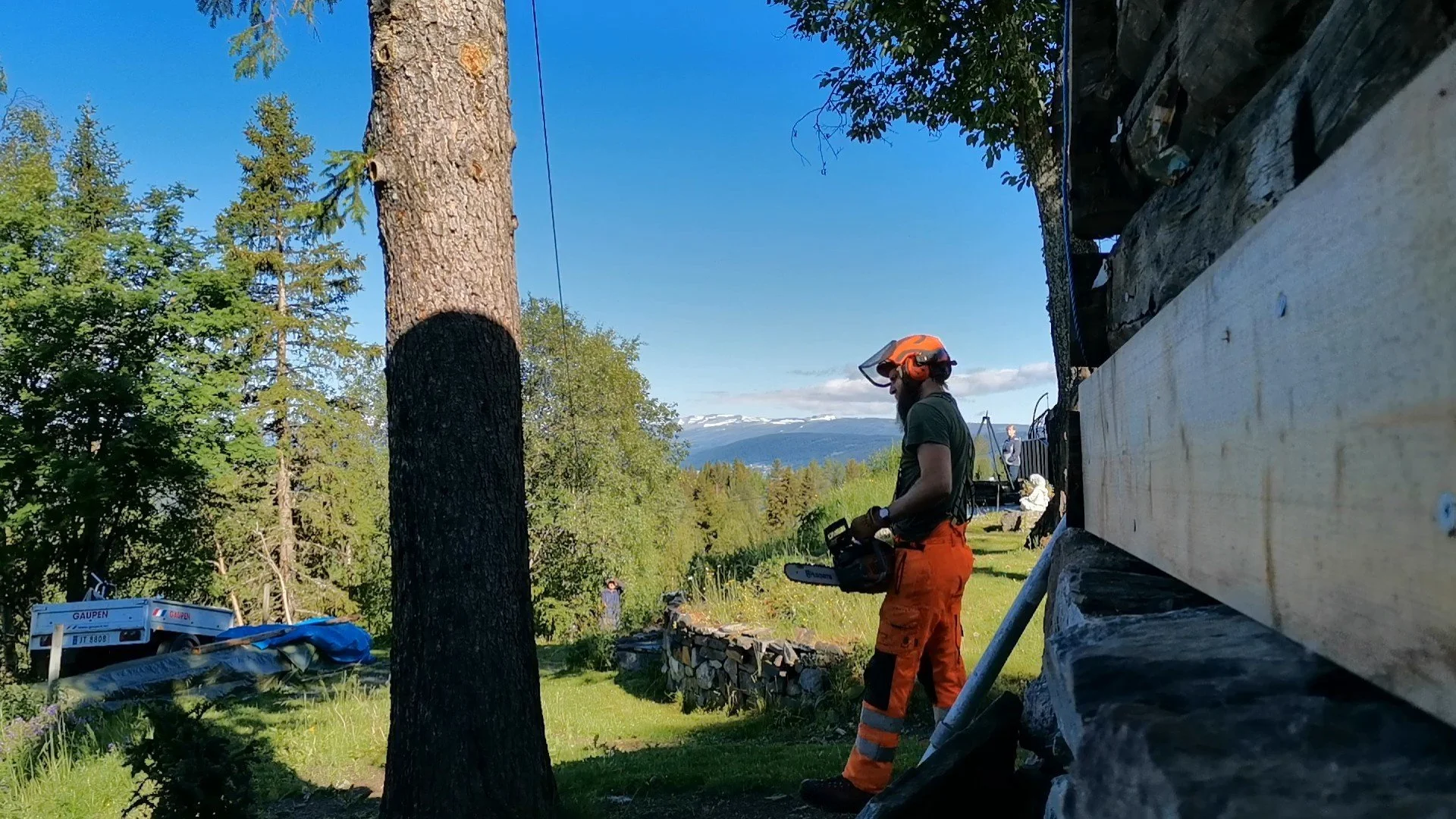 Felling og kvisting av store grantrær på gårdsbruk der noe av virket skulle brukes til materiale.