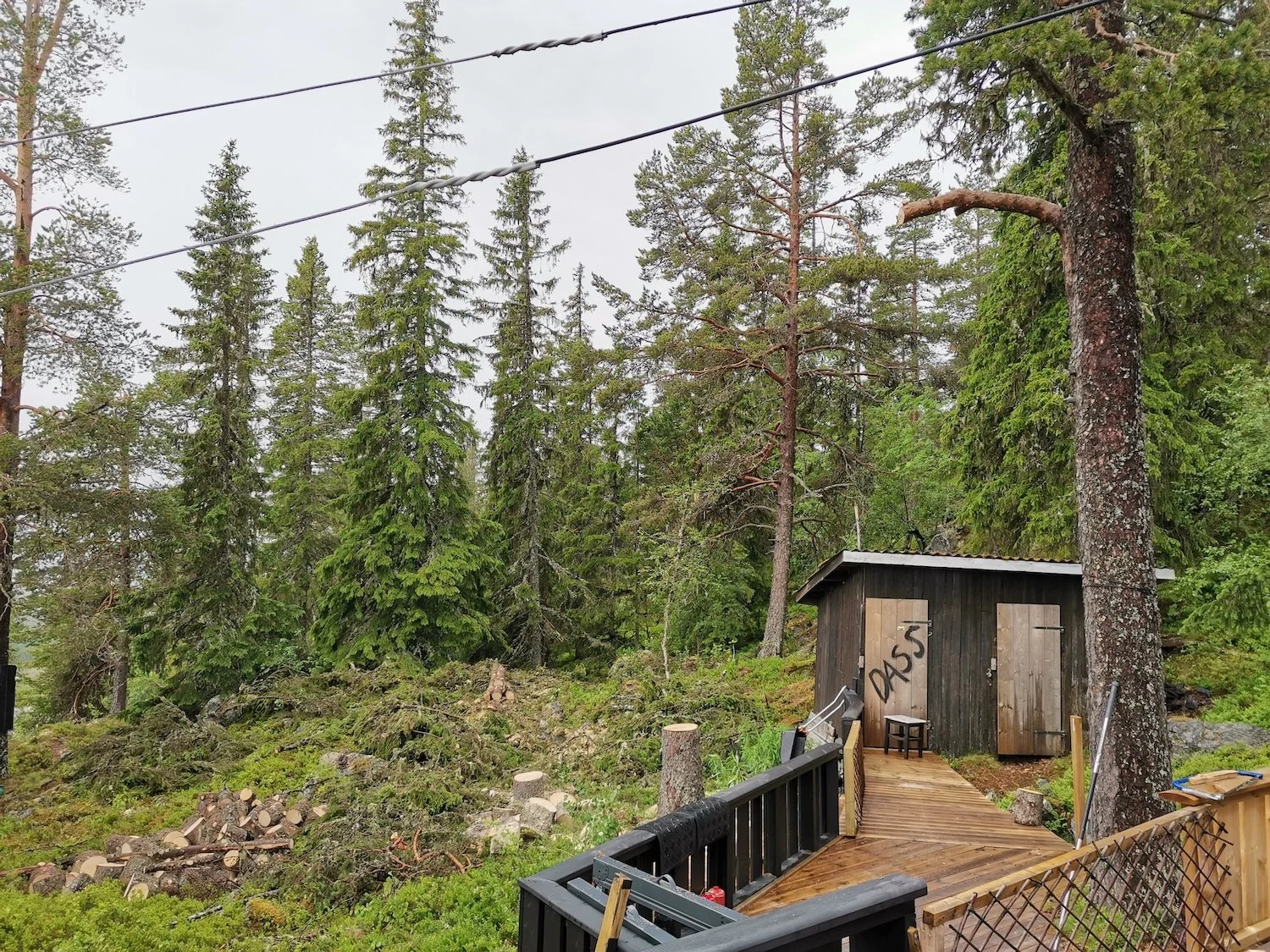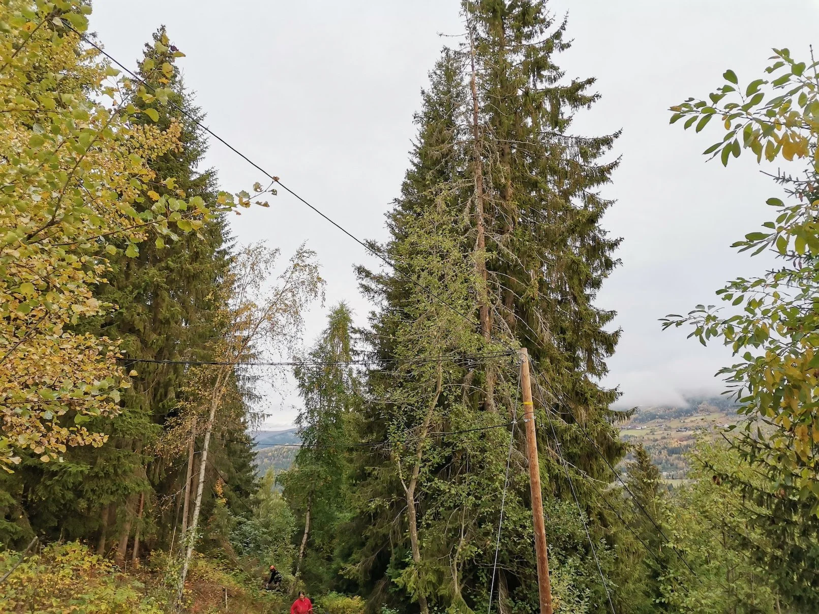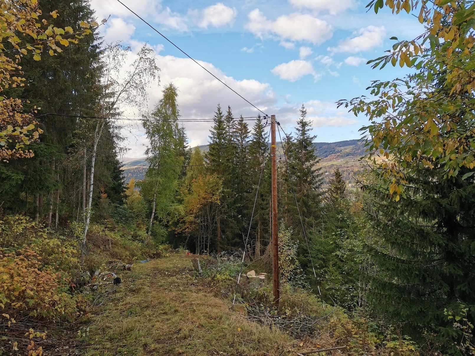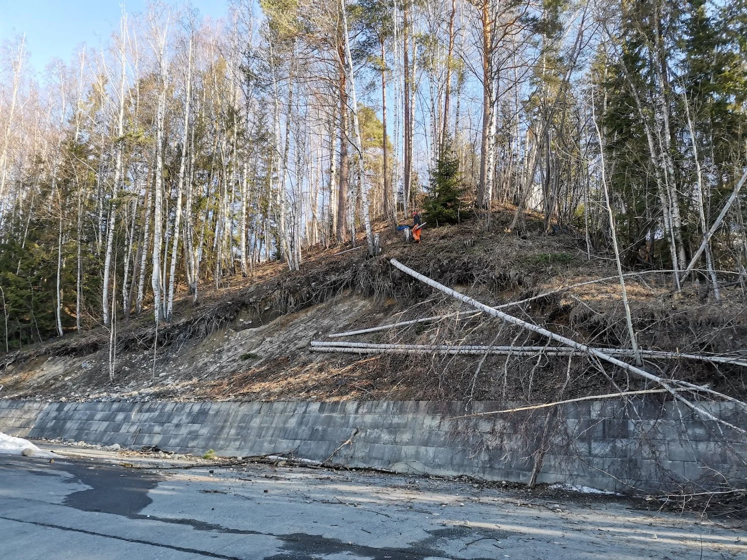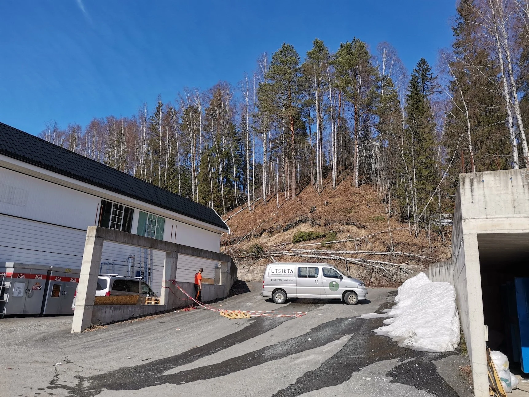 Felling, kvisting og vinsjing av grantrær i bratt terreng på hyttetomt.
