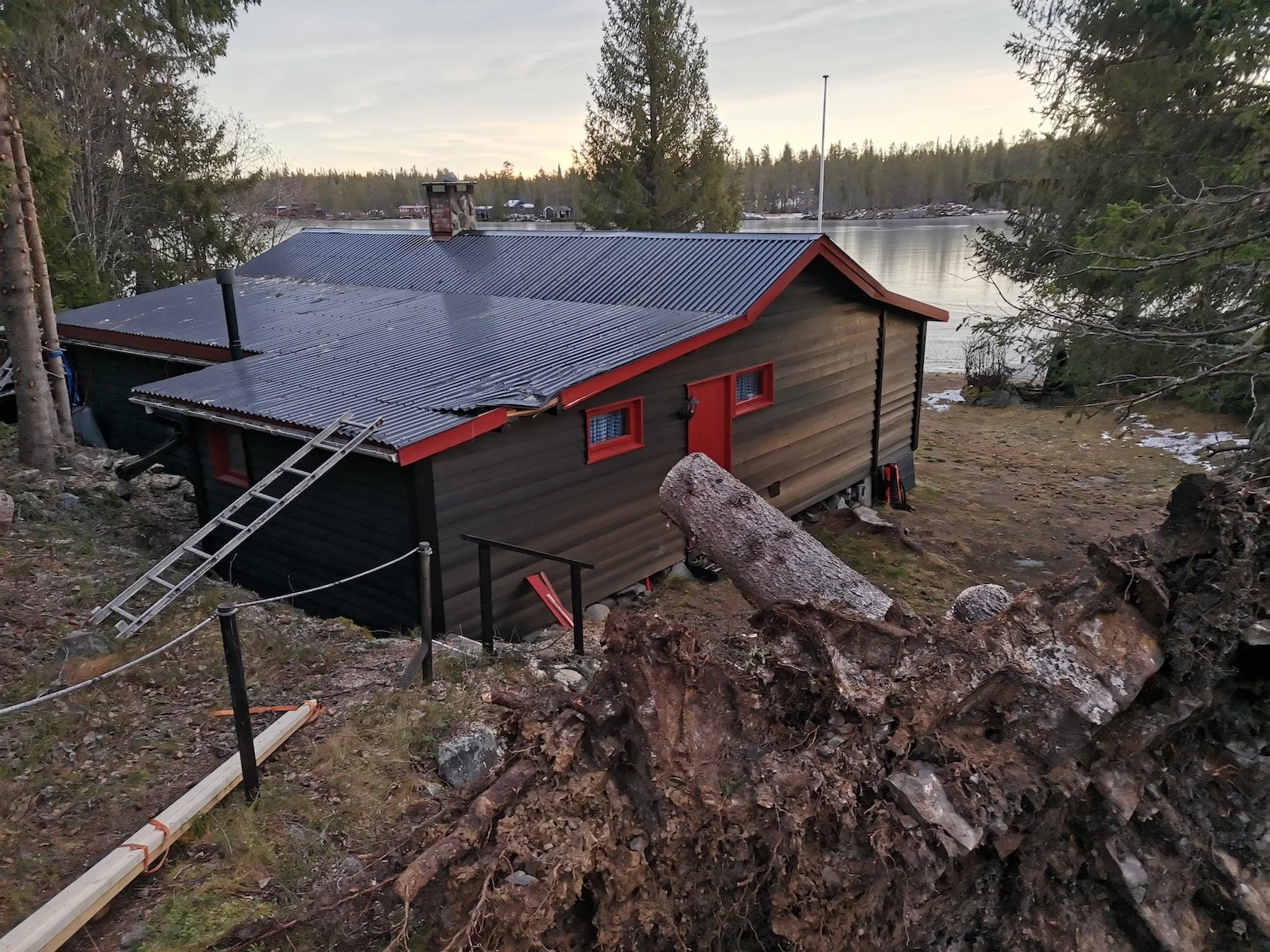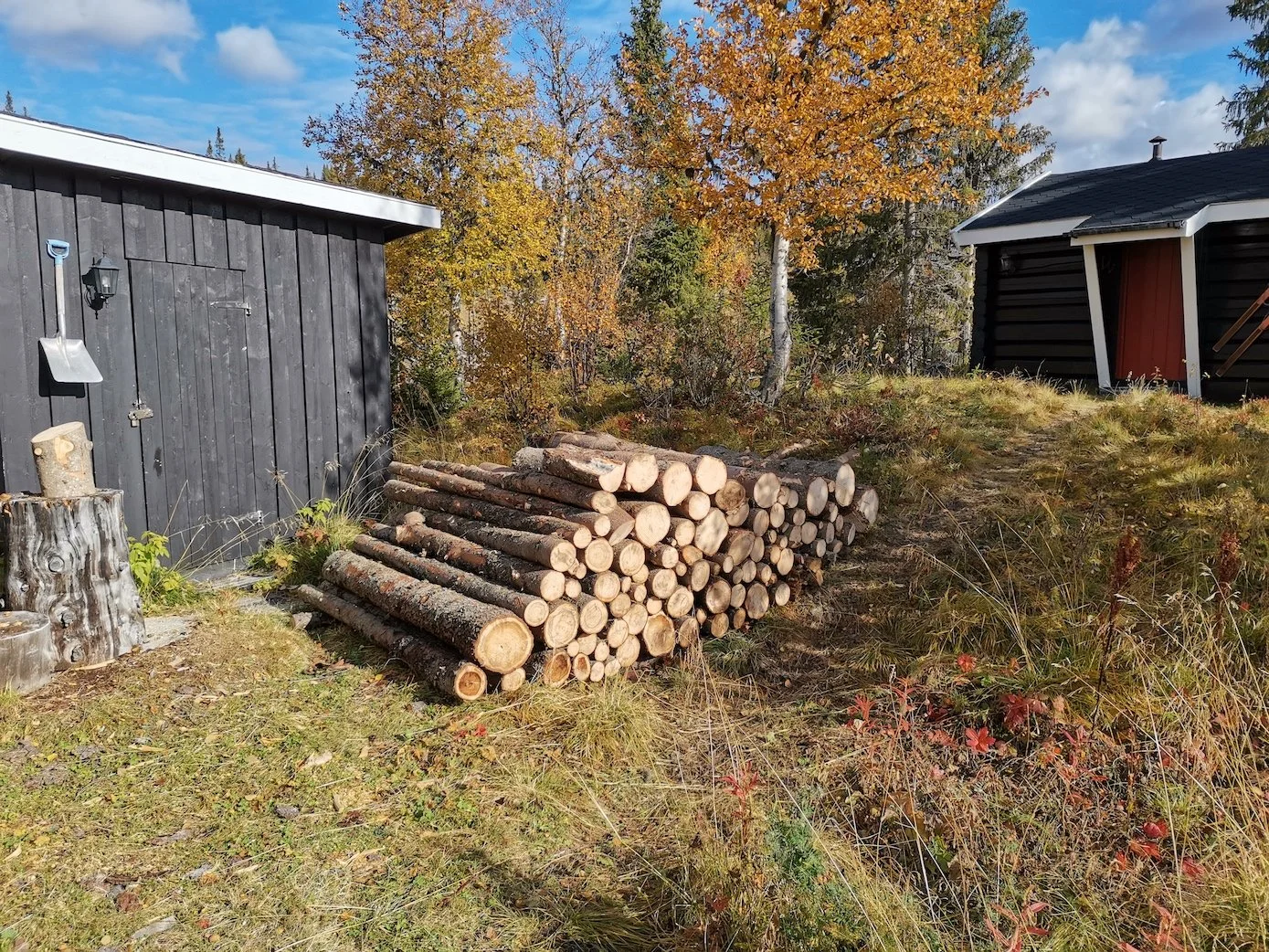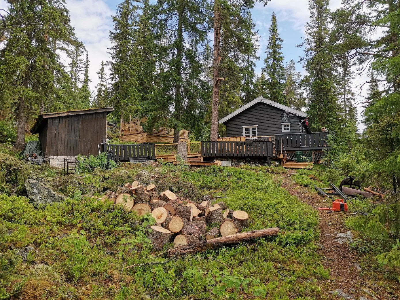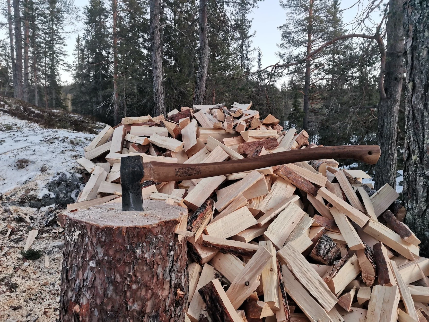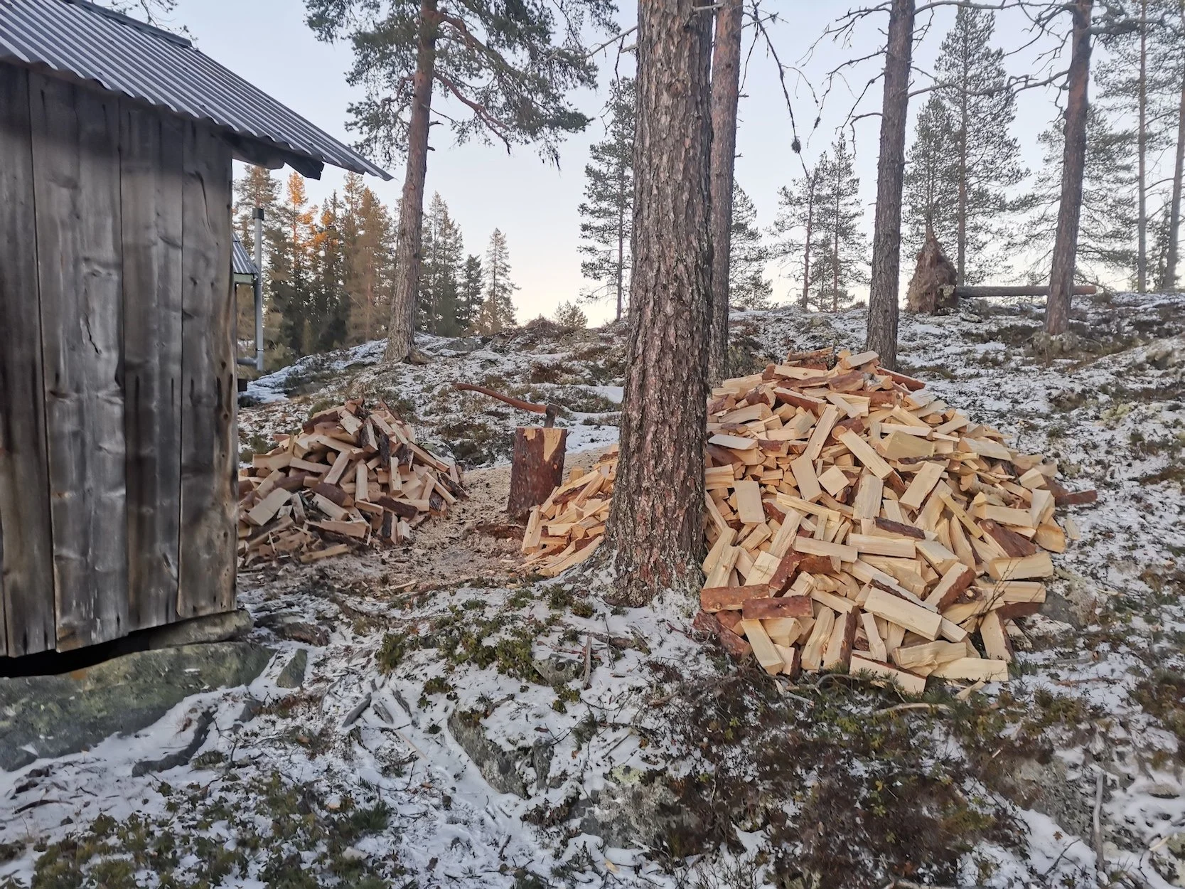 Opprydding etter vindfall og kløyving av ved på hyttetomt uten veiforbindelse.