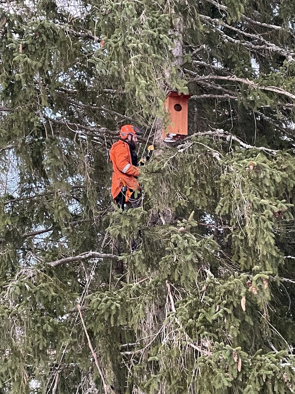 Montering av diverse fuglekasser i trær på hyttetomt ved hjelp av klatring.